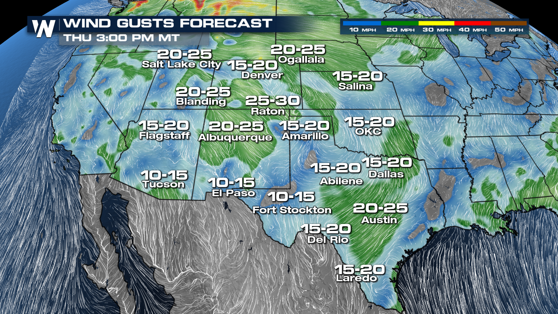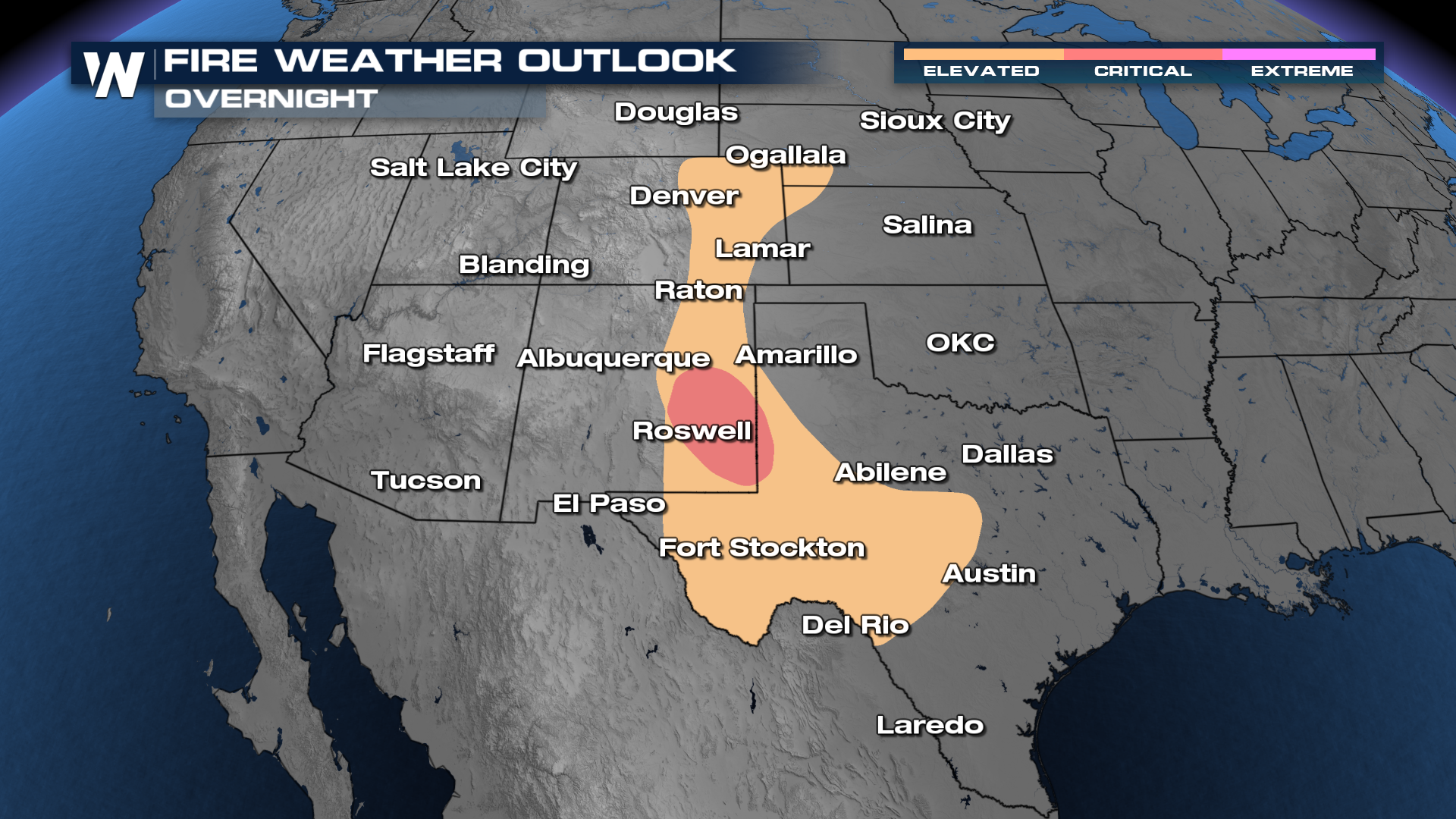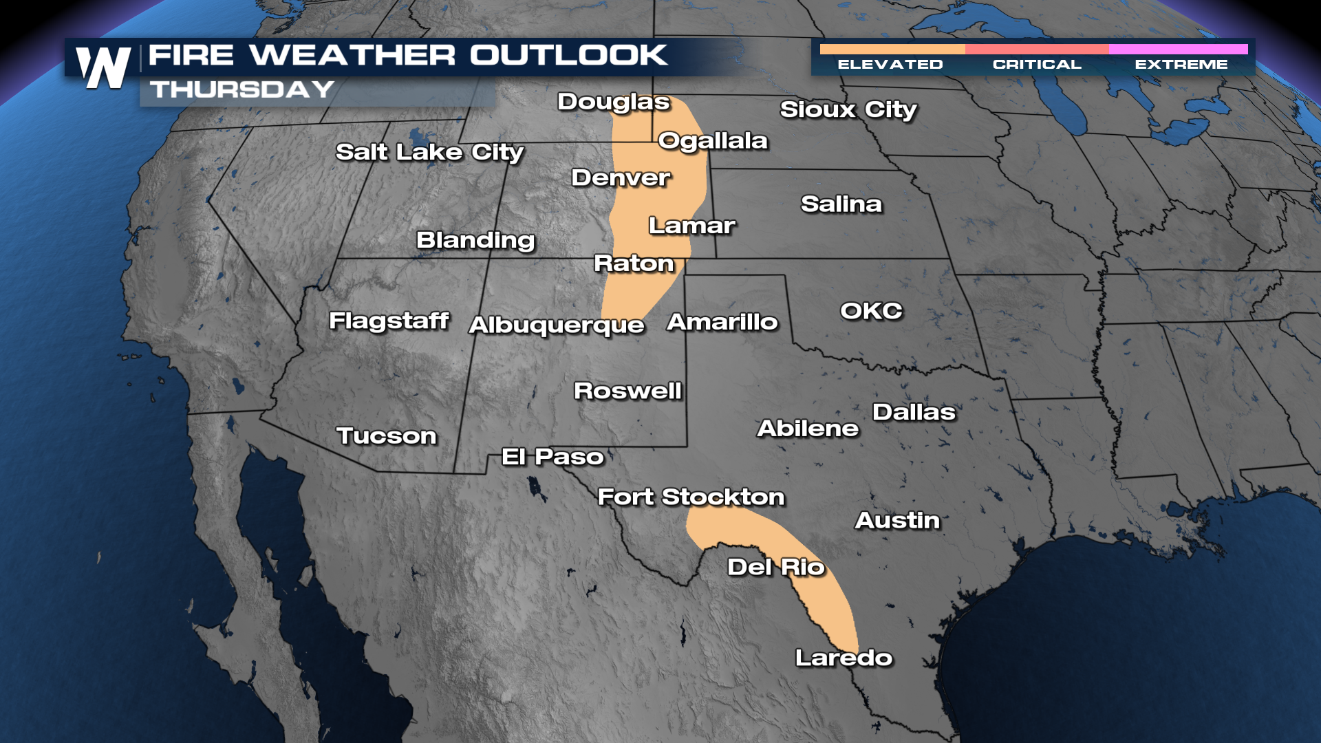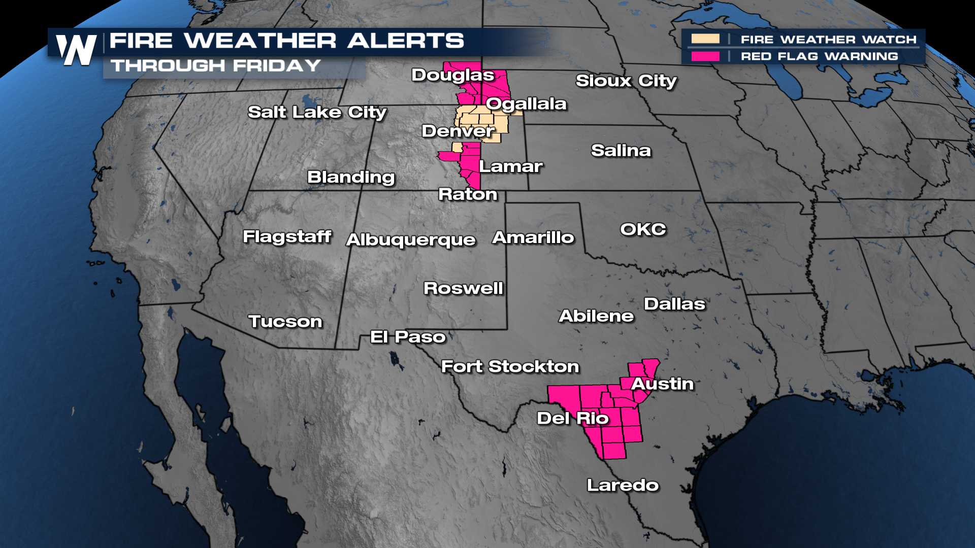 Last week, multiple fires broke out across the central plains, burning over 325,000 acres. The Ranger Road Fire has been completely contained after torching over a quarter million acres. The fire threat is back, and an elevated fire weather outlook is in place across New Mexico and Texas. Dry conditions and gusty winds have led to dangerous fire conditions. Red flag warnings and fire weather watches remain in place through Friday. Fires that do develop can spread rapidly.