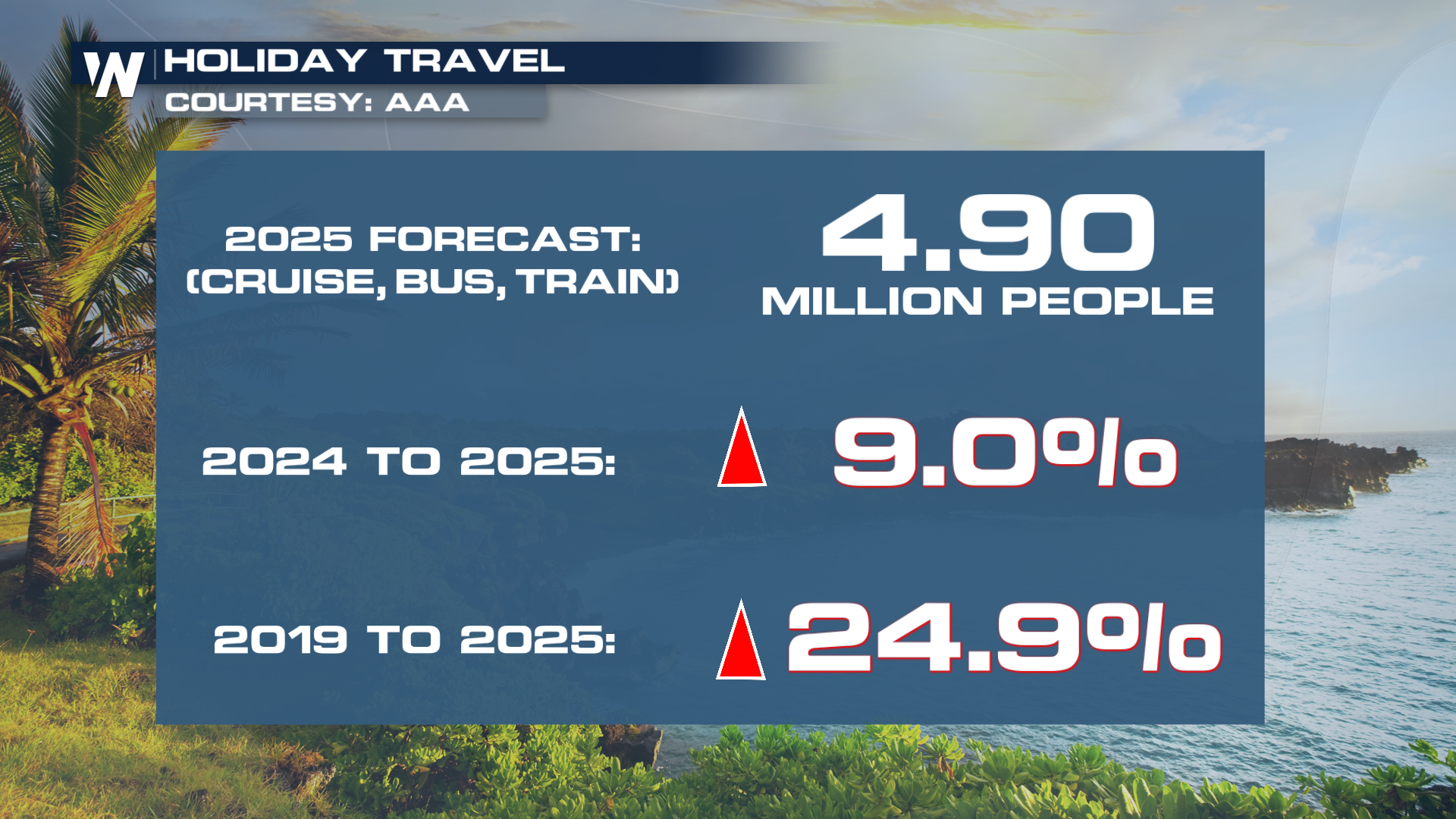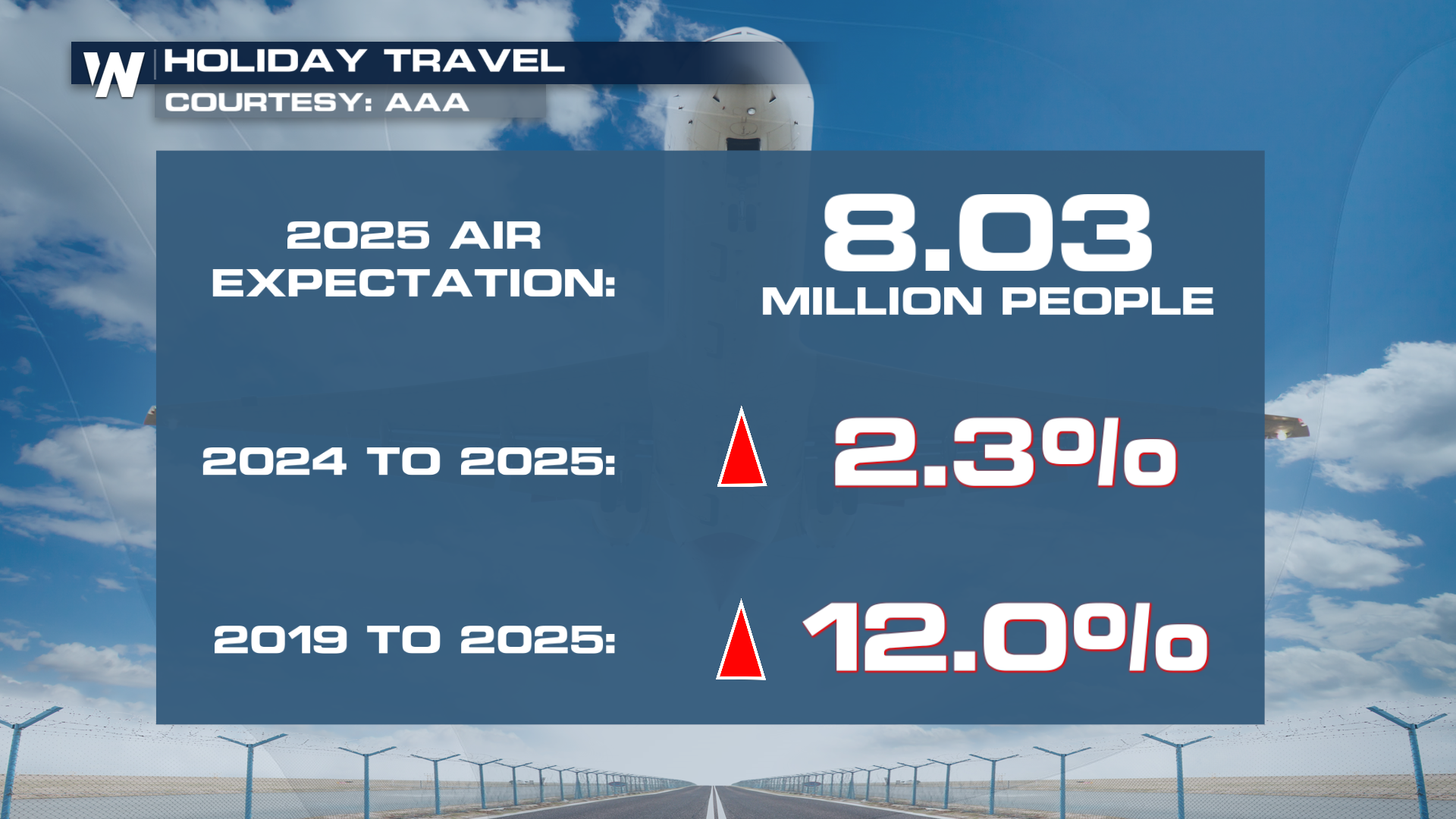 Air travel is also up since 2024 by 2.3%. AAA expects 8.03 million people to be traveling to their destinations for the holidays via airplane. This will be the first time air travel for the year end holiday will exceed 8 million.