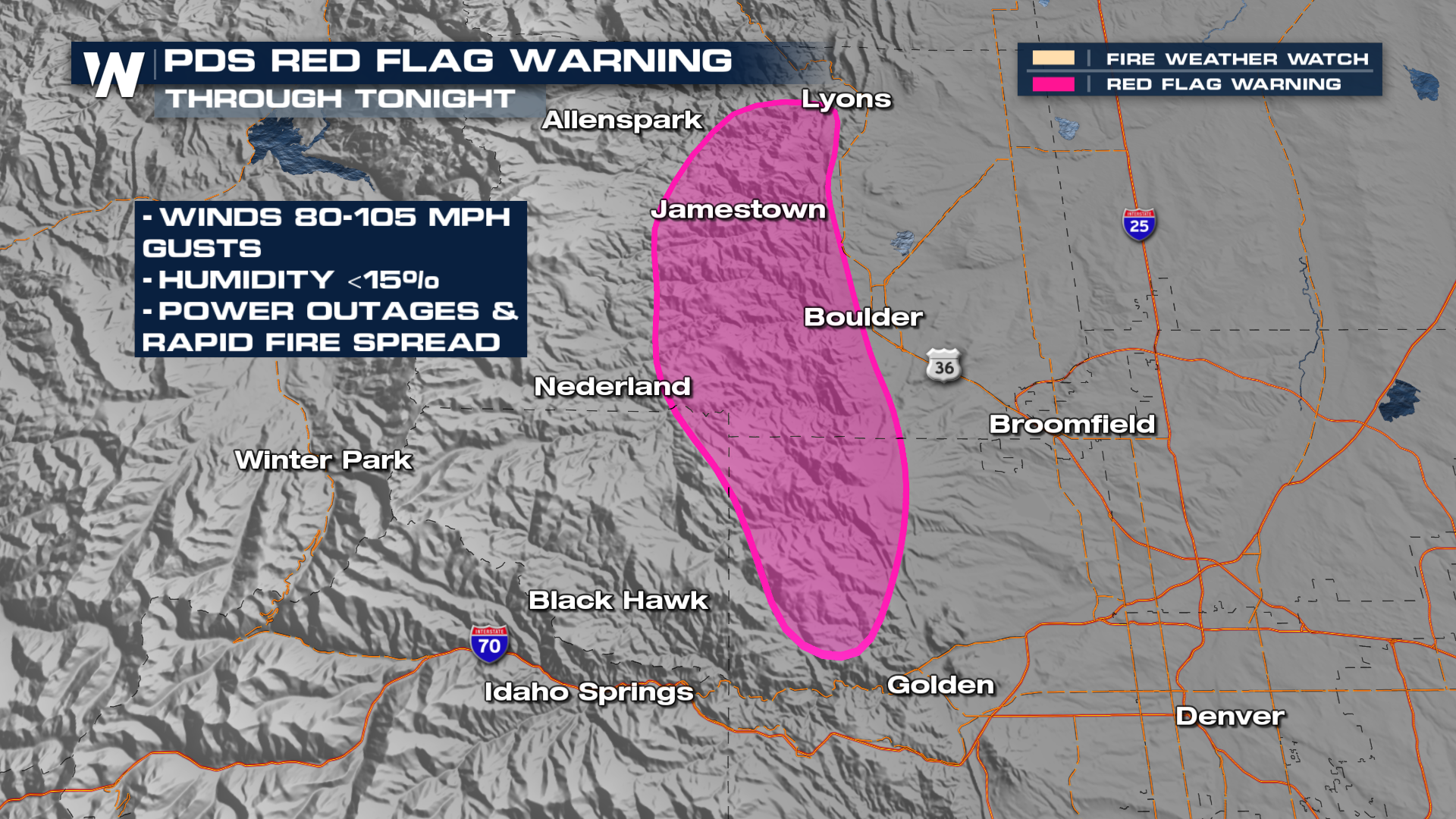 In addition, within the Red Flag Warning is a higher-end, PDS (Particularly Dangerous Situation) Warning. Here, to the west of a line from Golden to Boulder to Lyons, wind gusts could exceed 100mph! With downsloping winds, relative humidities will be low, possibly dropping into the single digits at times.