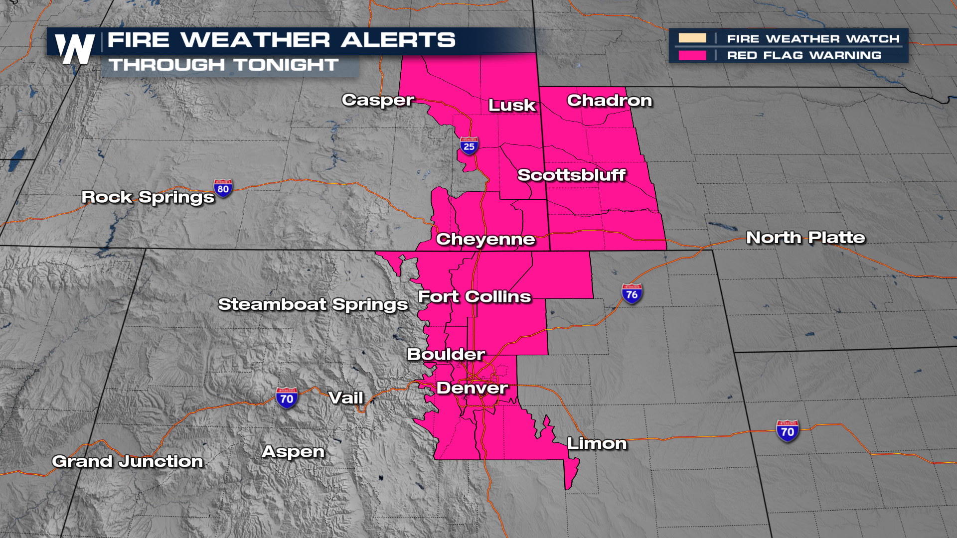 Red Flag Warnings will remain in place across the Denver metro area, northward into the High Plains of Wyoming, for the rest of the night.
