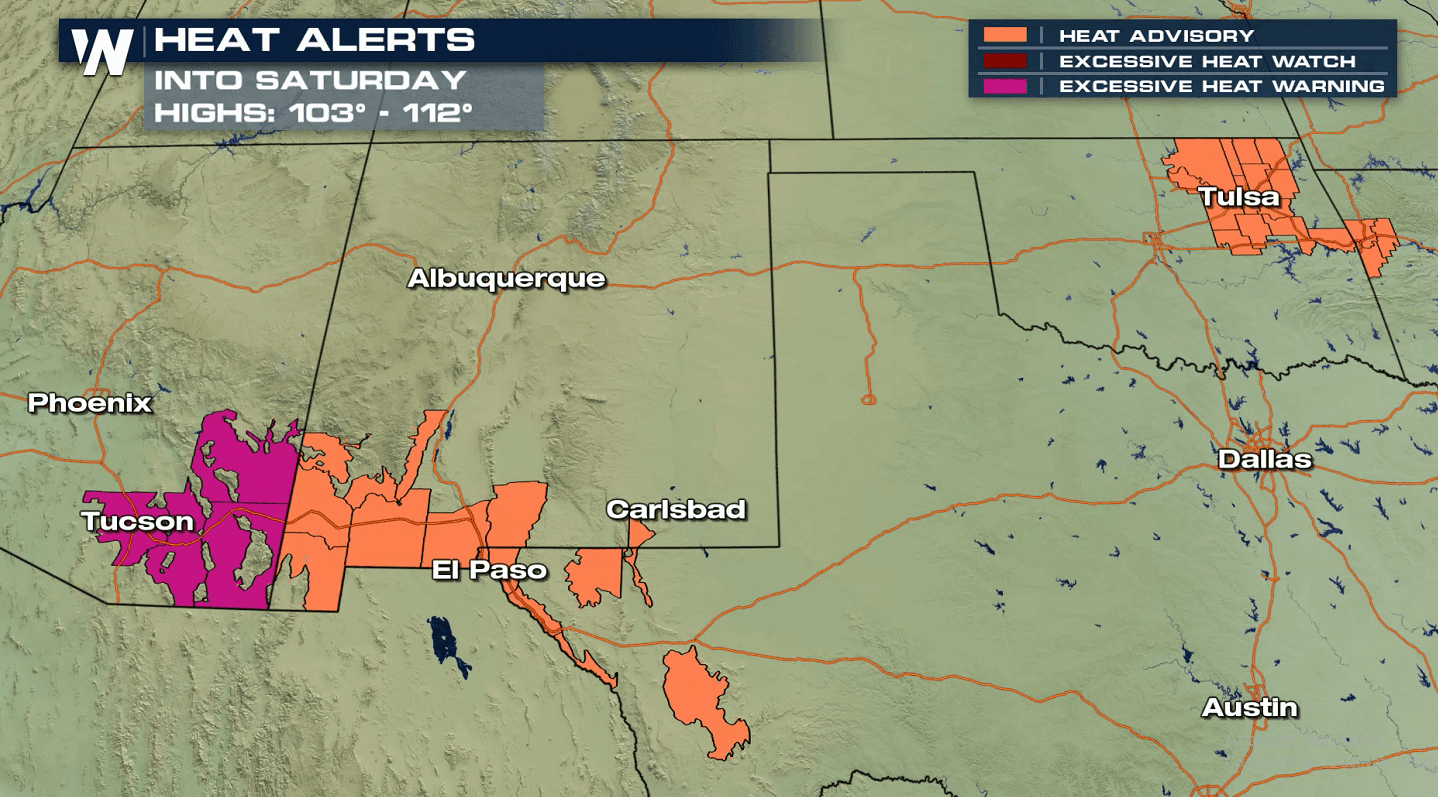 Excessive heat continues in the Southwest and is expanding into the Southern Plains. The mercury will once again soar well above 100 in interior areas of California, Nevada, Arizona, New Mexico, Texas and Oklahoma. A strong ridge of high pressure is located across the region, pushing temperatures well above average. Heat Alerts have already been issued into Saturday. Several record highs have been set this week.