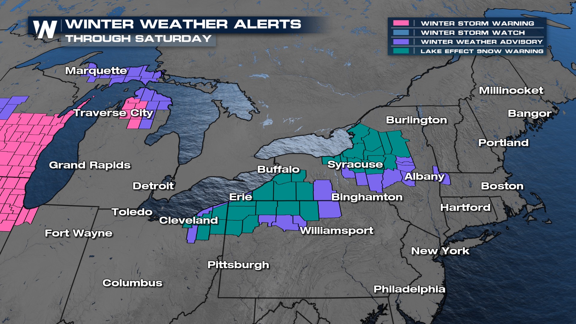 Winter weather alerts remain in place issued across the eastern shores of the Great Lakes through Friday. These winter alerts are for widely varying snowfall totals, with up to an additional six inches possible. Heavy snow and gusty winds could lead to whiteout conditions, where Snow Squall Warnings might be warranted.