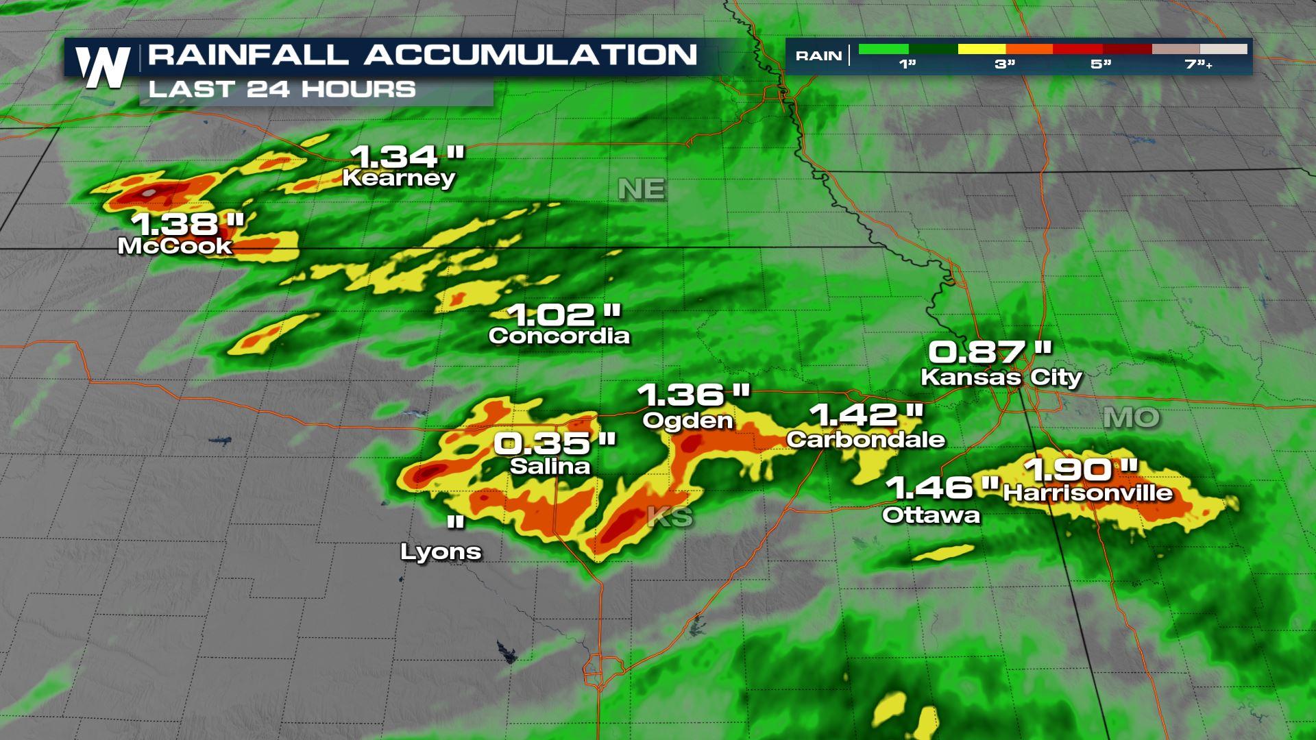 multiple rounds of storms containing heavy rain on the way through the end of the work-week, we are seeing an increase opportunity for flooding across the middle of the country. Over the last 24 hours, around 3" of rain fell in parts of Kansas and Nebraska.