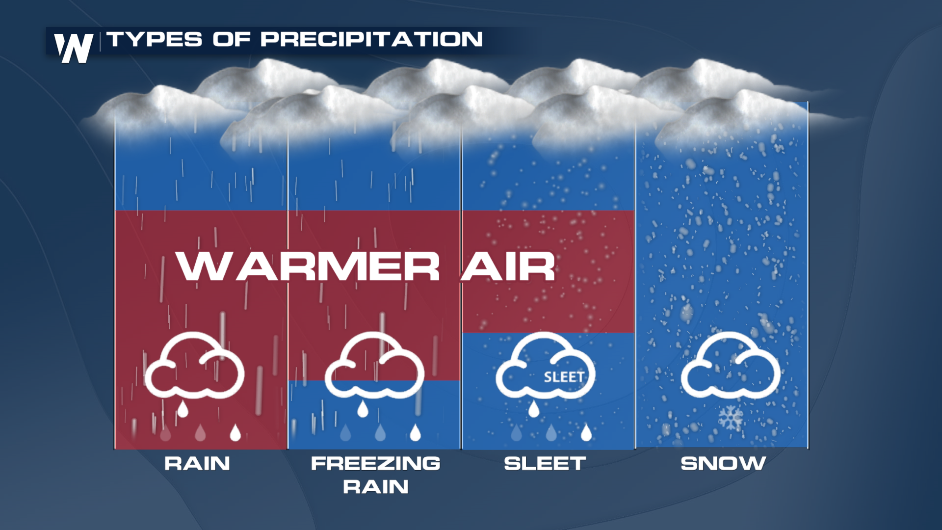 Several components come into play when we talk about different types of wintry precipitation, and the temperature profile of the atmosphere is one of the most important. In this forecast, a strong upper-level low will draw in cold air aloft. At the surface, a low will pull in warm Gulf moisture. What happens between these layers determines whether precipitation falls as rain, freezing rain, sleet, a rain/snow mix, or snow.