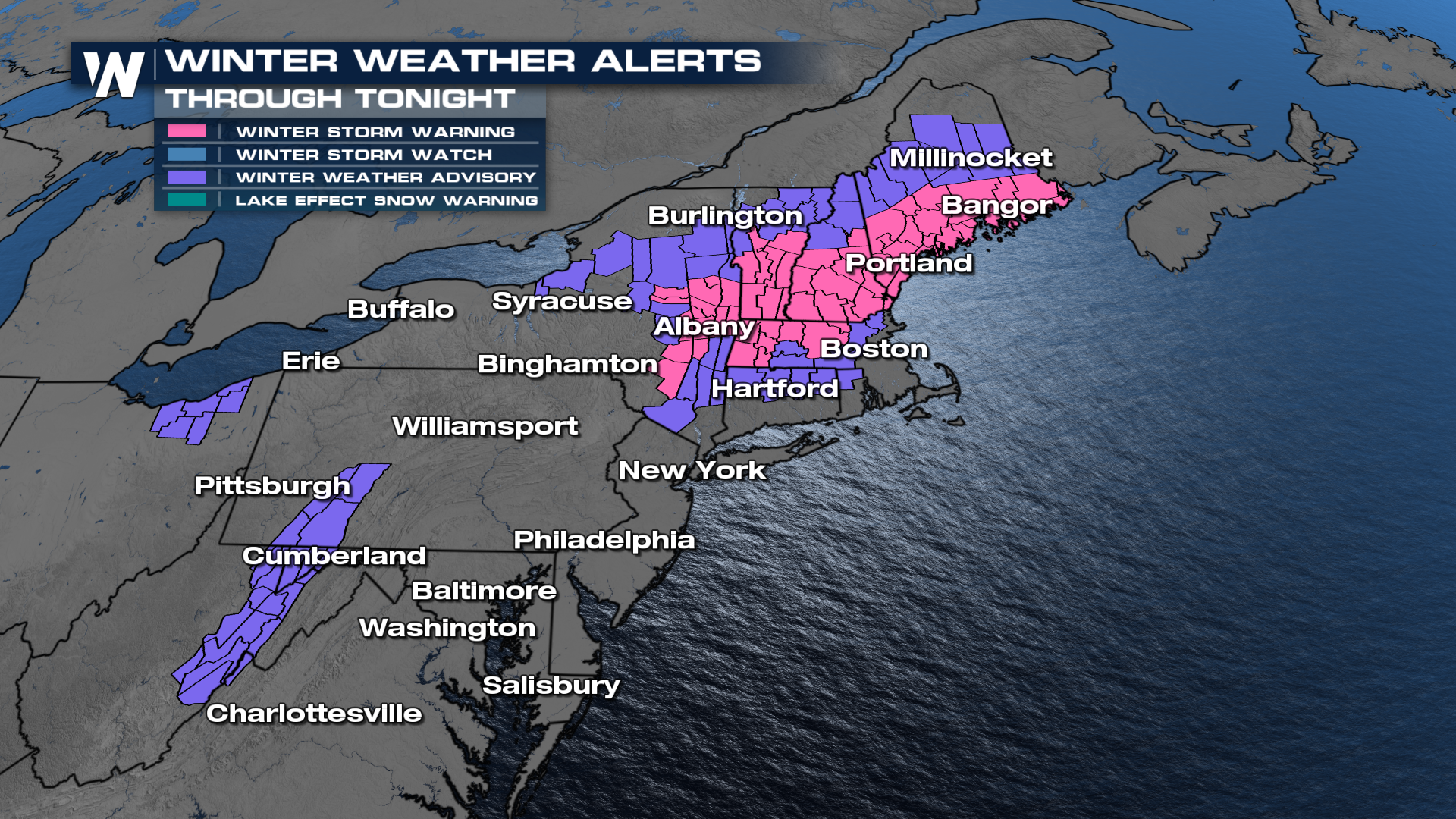 Winter alerts are starting to trim back as the low pressure system pushes farther north and east, but many remain in effect through tonight.
