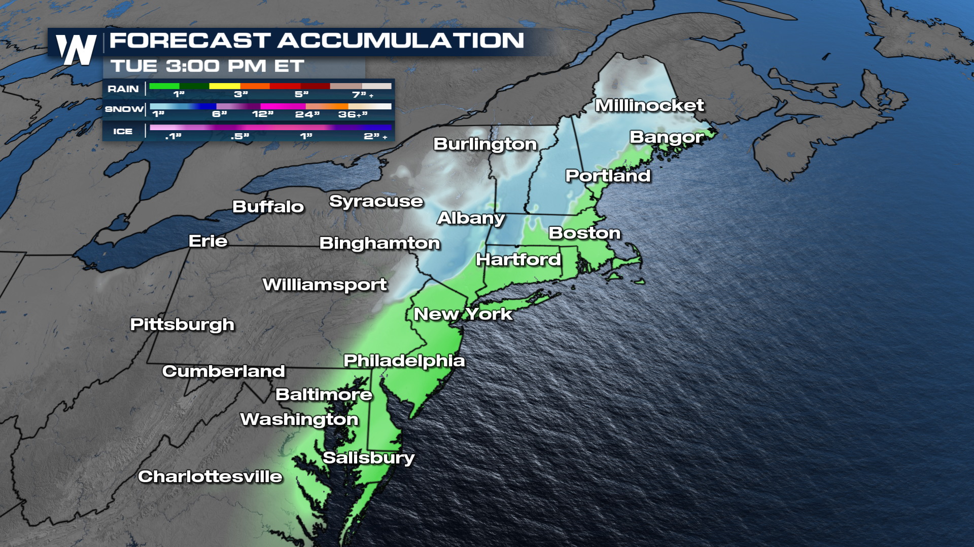Based on current timing, snow will reach the Northeast through Tuesday night before the system exits offshore early Wednesday morning.