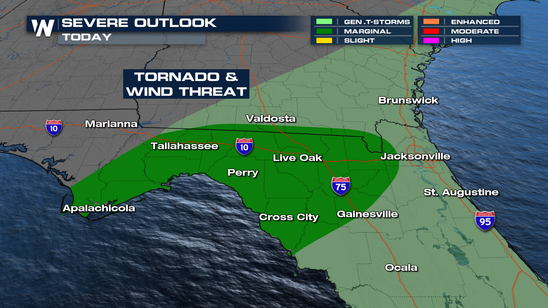 The Storm Prediction Center has kept a MARGINAL risk for severe storms in the panhandle of Florida through Tuesday. The risk of a tornado or two will be there, along with damaging straight-line winds.