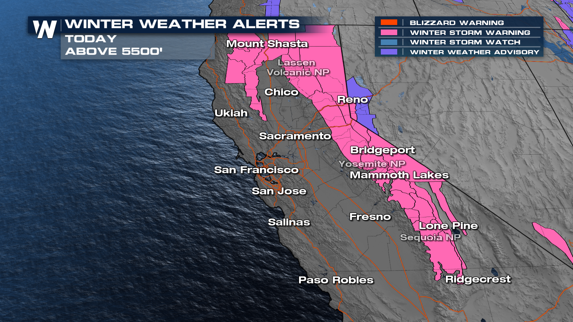 Heavy snow will accumulate over the Sierra Nevada Mountains through Friday, leading to travel impacts and the potential for delays. Winter Storm Warnings have been issued all across California. 3-5 feet of snow is expected, with some areas seeing higher totals.