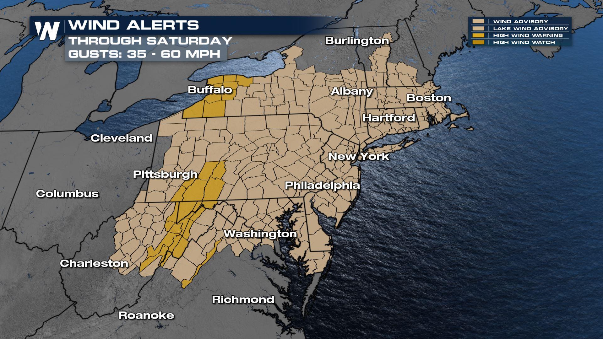 Gusts have topped 60 mph in numerous locations and will still have the potential for those damaging gusts through Friday into early Saturday across the Northeast.