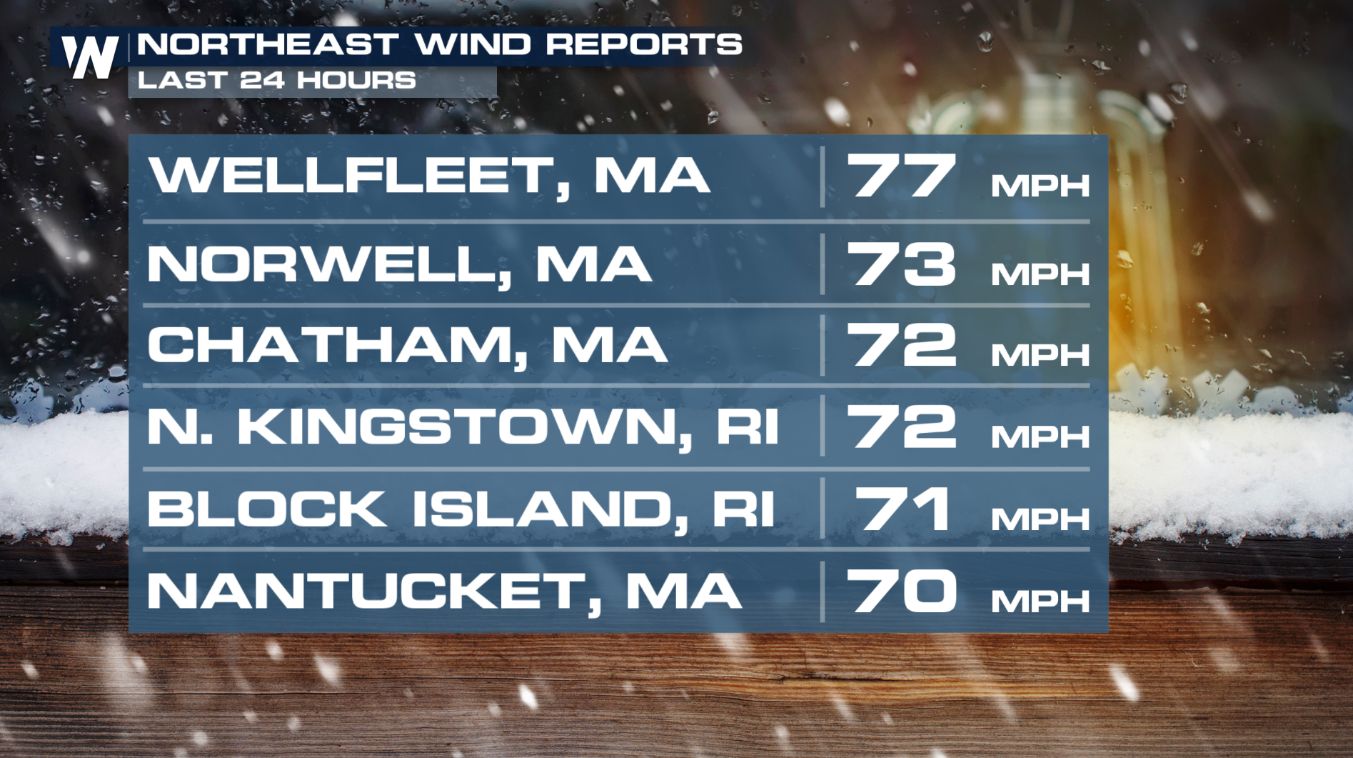 Wind gusts have been hurricane strength in some parts. Wellfleet, MA reached a gust of 77 mph, which is Cat 1 strength.