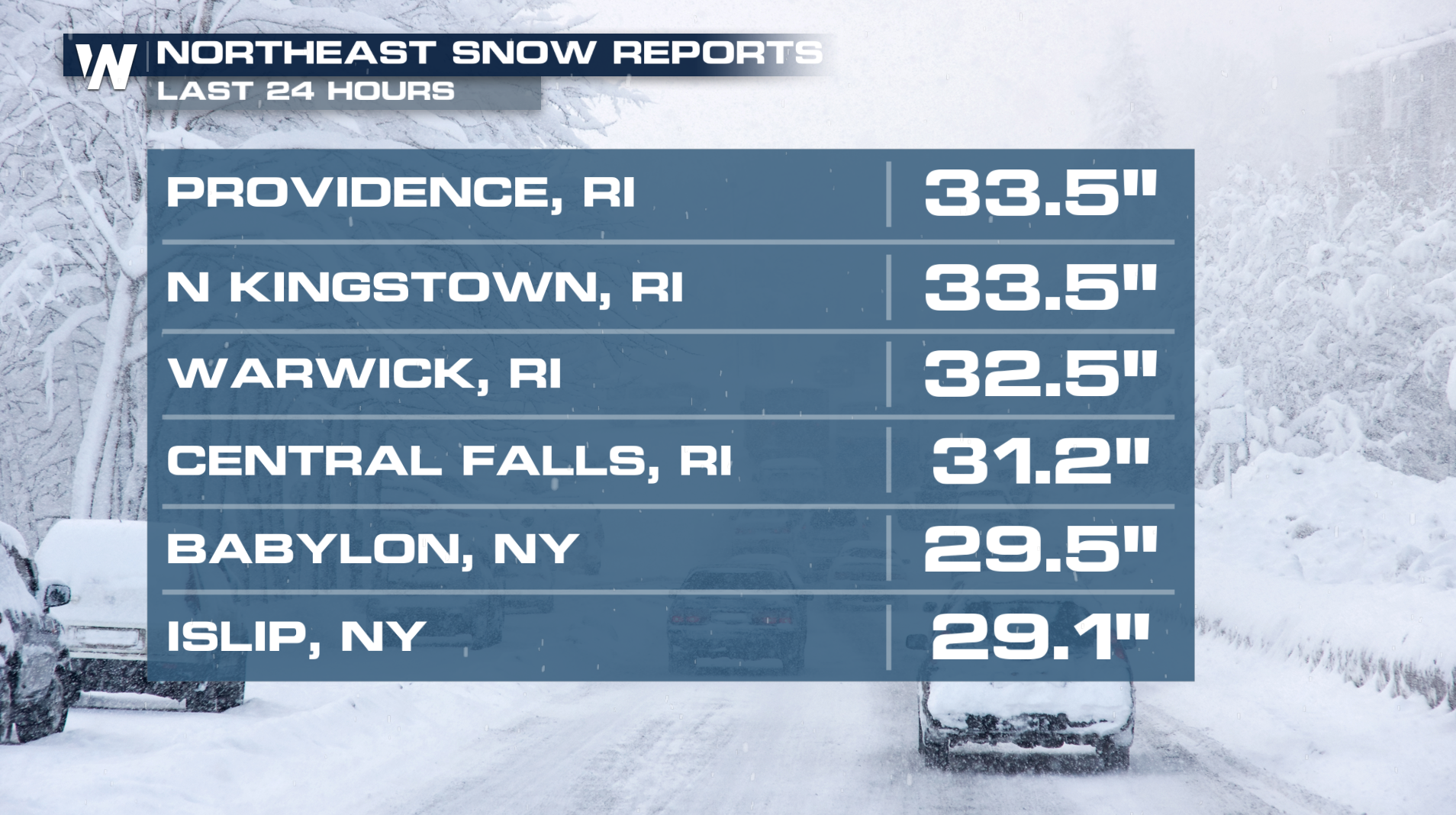 Snowfall totals have well surpassed 2 feet across portions of the Northeast! Providence and Kingstown, Rhode Island, have seen 33.5" of snow so far with this major system.