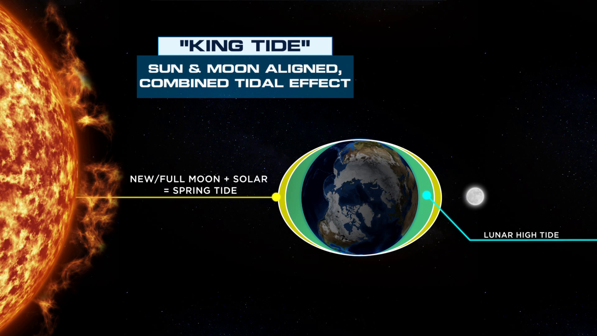 When the gravitational pull of the sun and moon are both higher than normal, high and low tides become more pronounced, leading to flooding during high tide and potentially low water issues during the low tides.