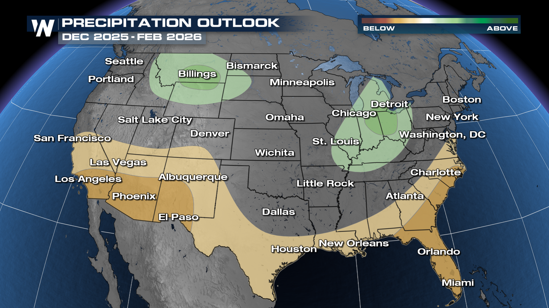 The precipitation outlook also favors conditions fairly typical for a La Niña winter, with above average precipitation favored around the Northern Rockies and Great Lakes/Ohio Valley.