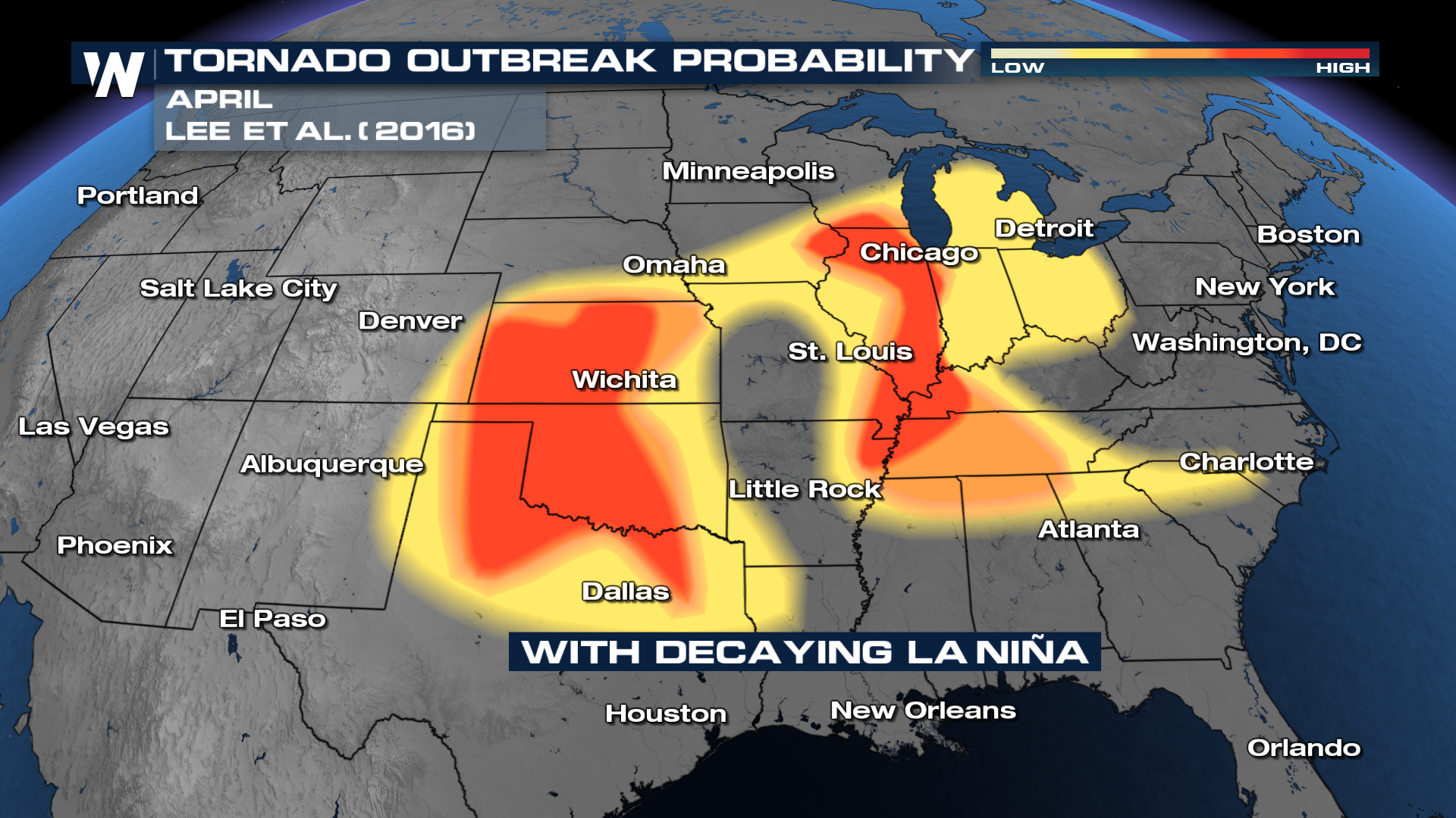 La Niña is expected to decay through the spring months, which can have a big impact on the severe weather season. Studies have shown a increase in the potential for tornado outbreaks over certain areas of the country as La Niña decays into a neutral or El Niño phase. These favored areas include the Central/Southern Plains and around the lower Great Lakes into the Mid-Mississippi Valley.