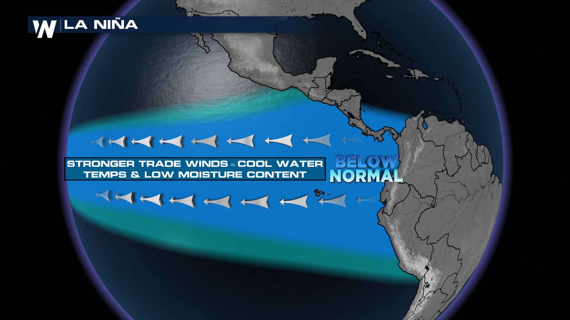 La Niña is one phase of a large circulation over the equatorial Pacific Ocean. The prevalent wind direction will churn up cooler or warmer water, based on the direction of the circulation. When winds are prevailing from the east, it churns up cooler waters near the coast of South America and to the west, while areas in the western Pacific see warmer than average water temperatures during this phase. These cooler waters, along with other large scale circulations, impact how air flows across the United States.