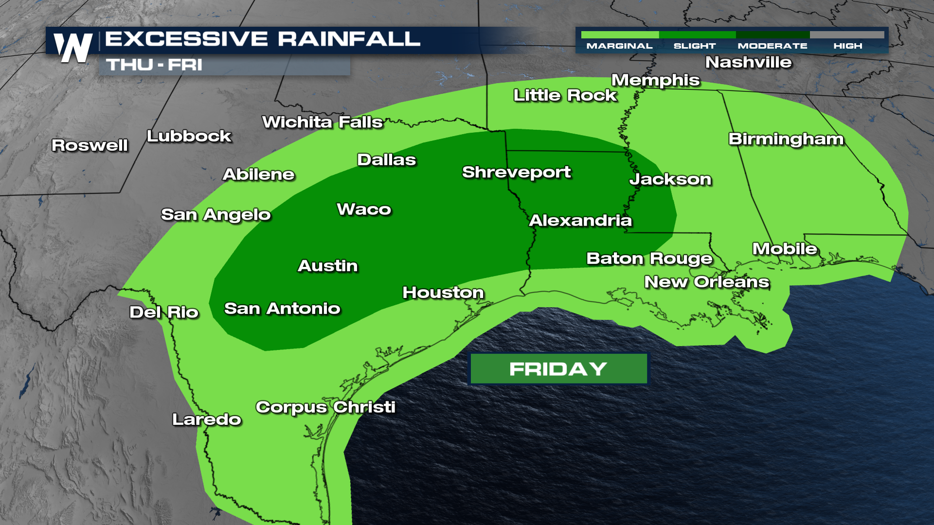 The Weather Prediction Center has highlighted areas on both Thursday and Friday with a Slight Risk Excessive Rainfall Outlook. Thursday's risk highlights the Texas Hill Country eastward to the I-35 corridor. On Friday, the flooding threat shifts east, encompassing much of East Texas and northern Louisiana.