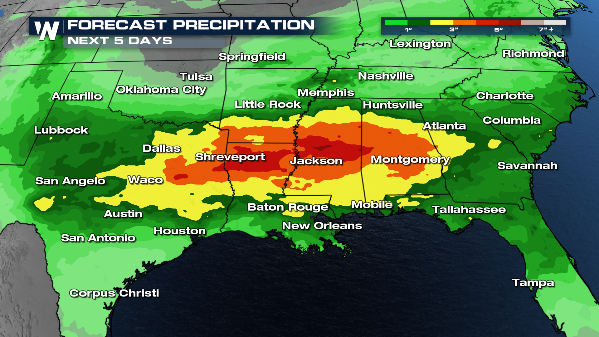Because the front never clears the Gulf Coast, the steady stream of warm, moist air arriving from the South doesn't shut off. As energetic winds overhead remain in place, plenty of lift will support the daily formation of thunderstorms. These thunderstorms will have plenty of moisture to work with and could have extremely high rainfall rates.