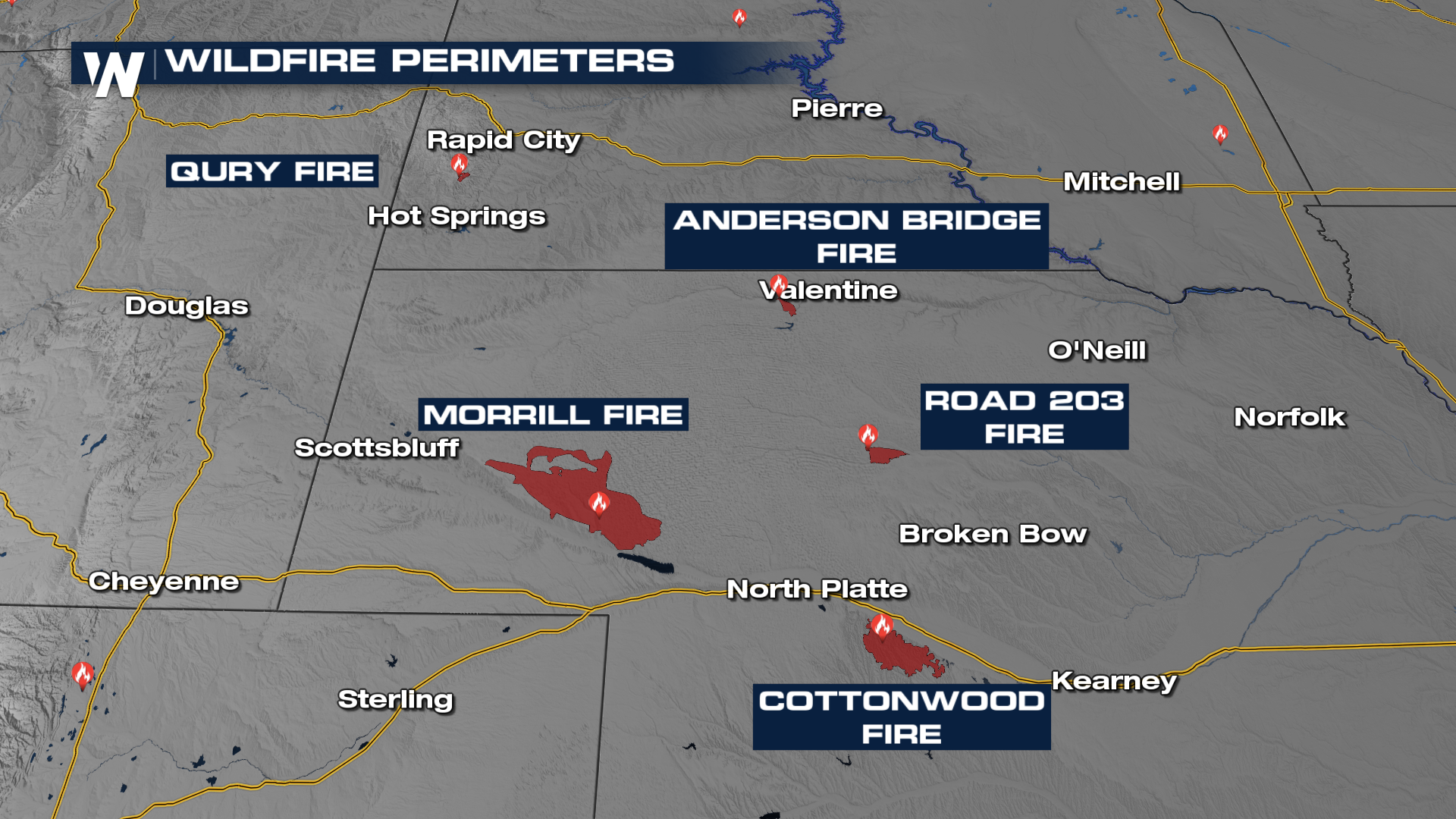 The governor of Nebraska Jim Pillen issued an emergency proclamation to unlock state resources and support the response to multiple wildfires in central and Western Nebraska. The fires include: