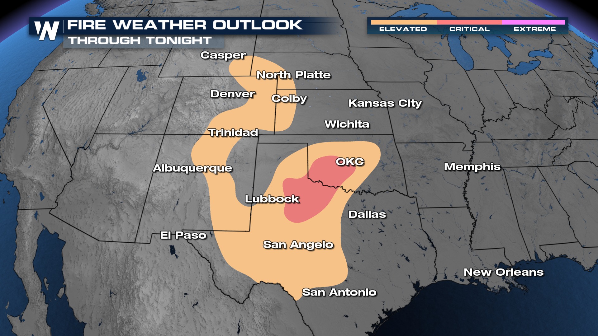 Fire Outlooks and ForecastFire weather outlooks have been issued by the Storm Prediction Center through Wednesday afternoon. Most of the Plains are under elevated fire danger with winds over 30 mph likely and relative humidity down to the single digits.