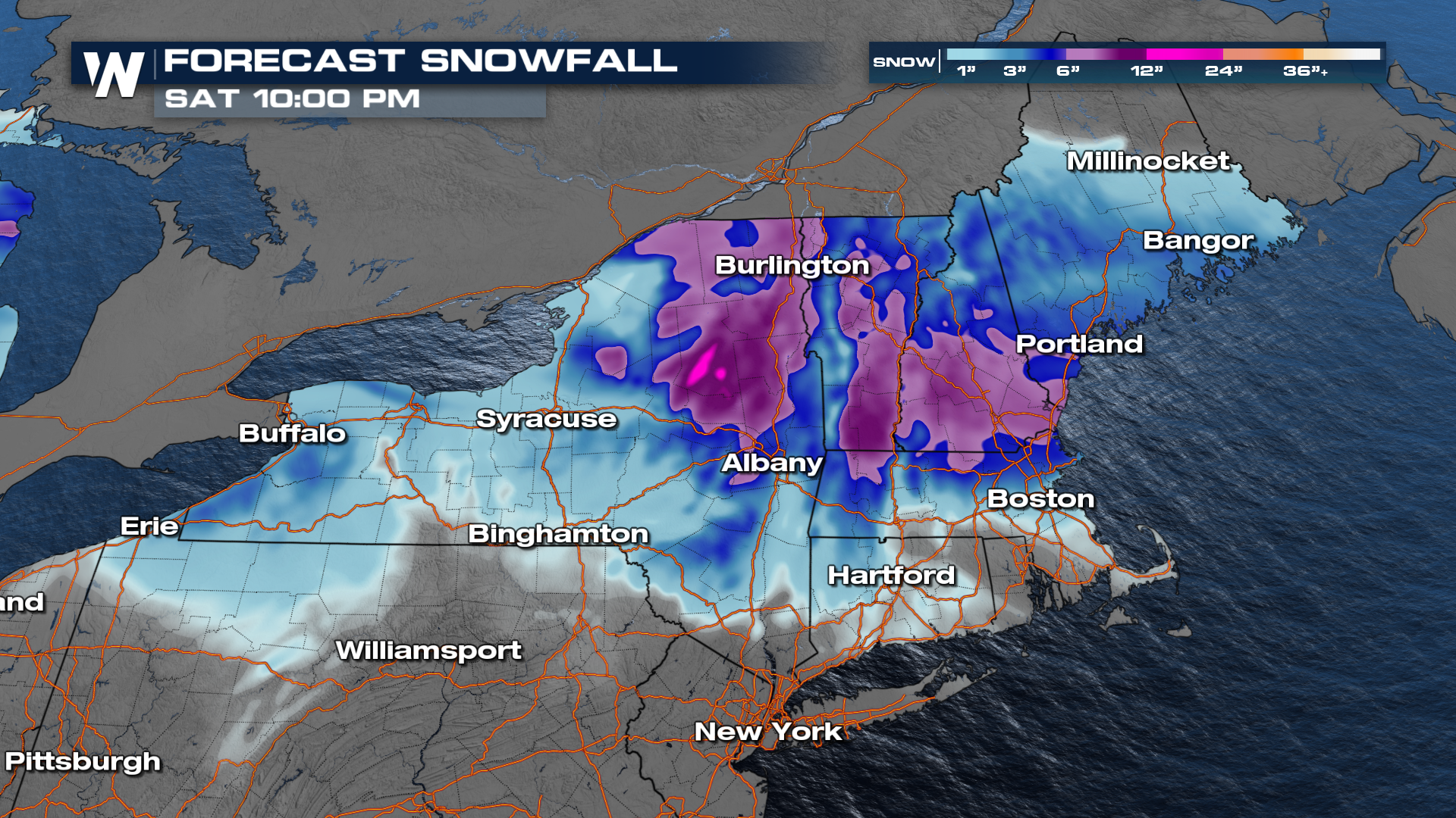Snow has become more widespread across Upstate New York and into New England today. As trough of low pressure moves through the region into Saturday, more cold air will wrap into the system allowing for more wintry precipitation.
