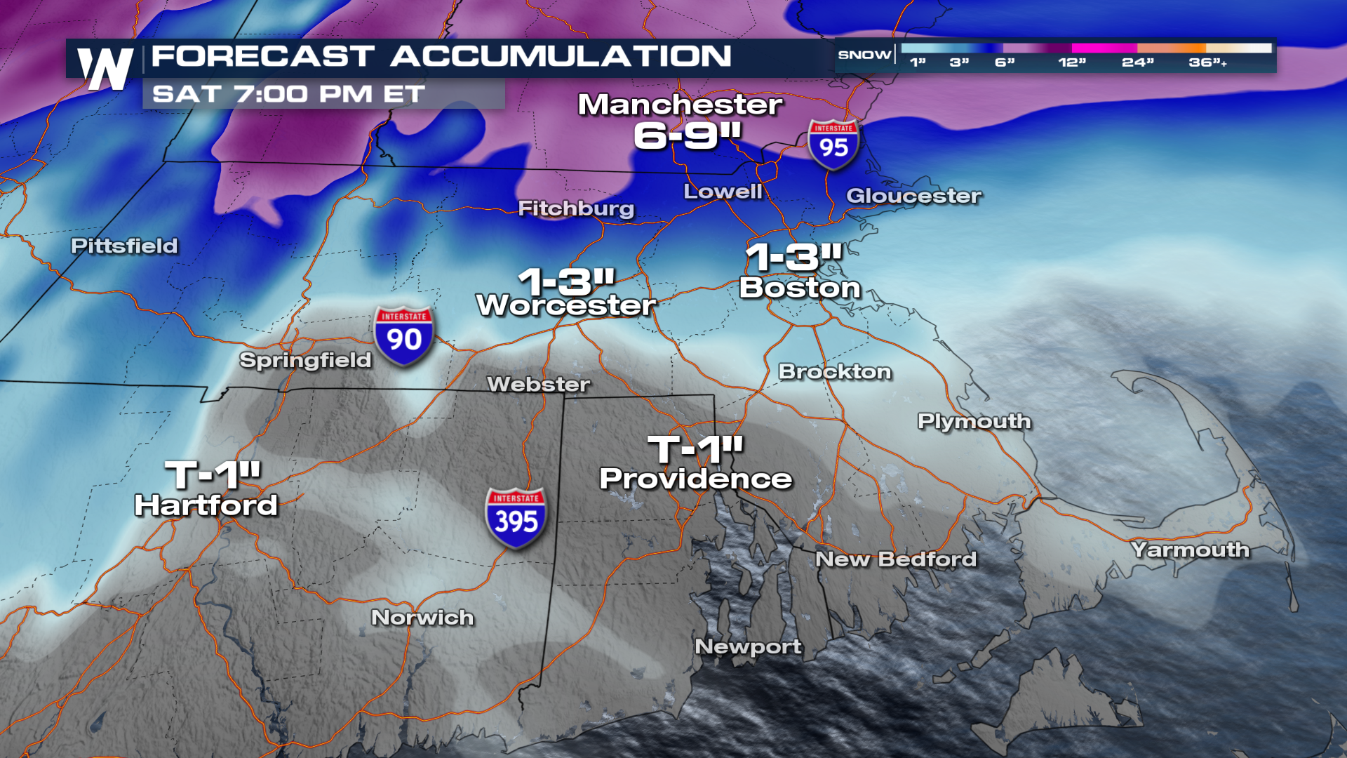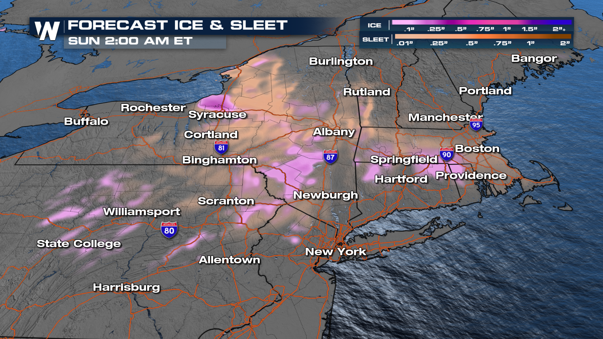 Lower elevations will be closer to 1-3", including cities like Boston. However, we could see sleet and freezing rain mixing in and adding to issues here. Icing totals will be around a tenth of an inch in some spots, so be careful for slick roadways. Locations in orange could see sleet, which will accumulate more like snow.