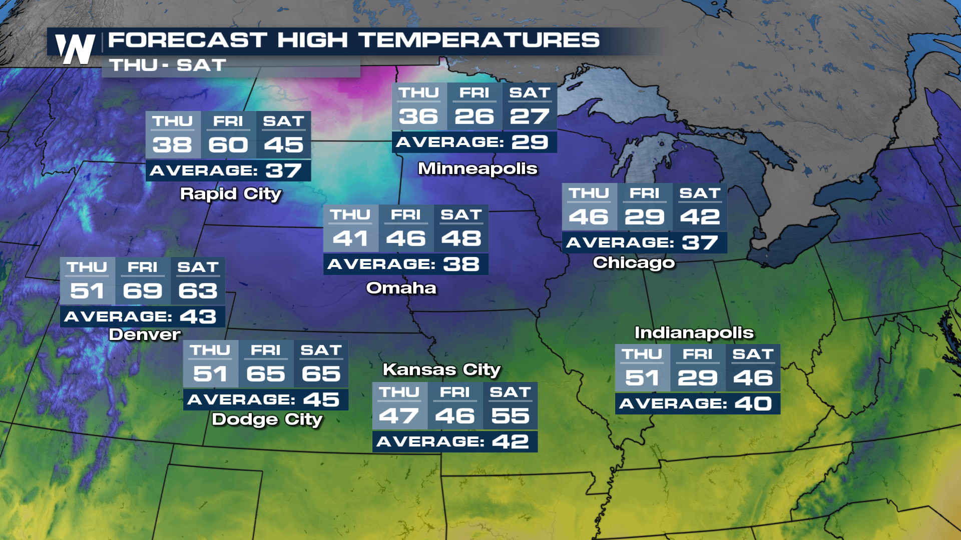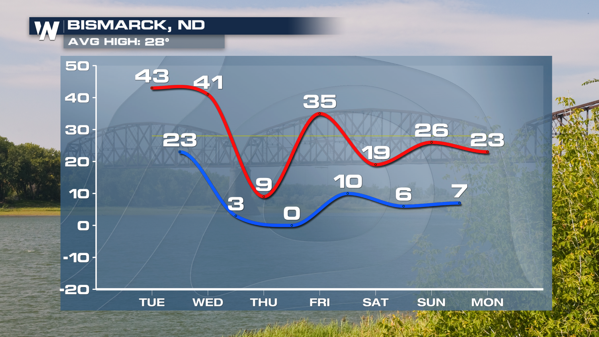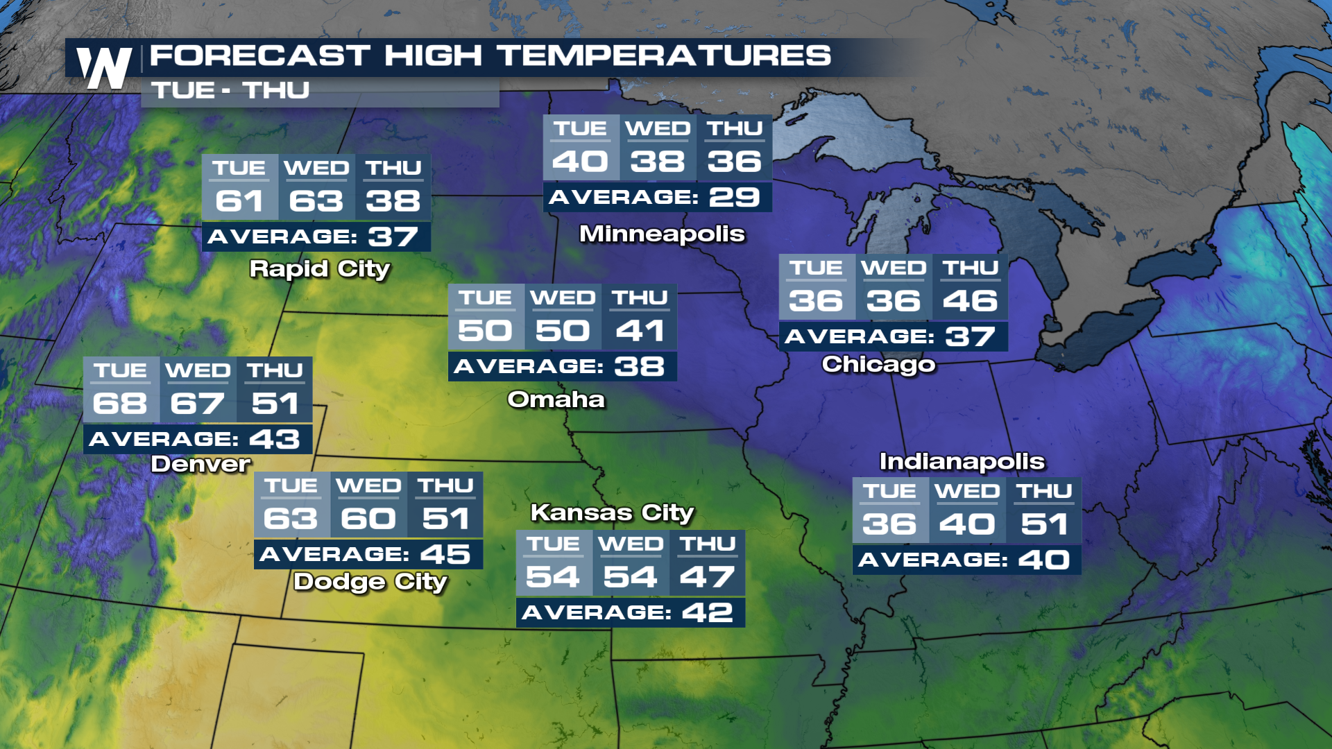 More importantly, the temperatures swinging on the other side of it will send another chill down the spine of the Heartland. Wednesday night will be the rudest, while Thursday night will likely be the coldest, but should see the winds subsiding. Bismarck, the usual poster child for nasty cold, will only top out in the single digits Thursday afternoon.