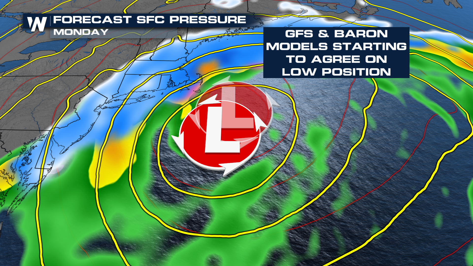 Strong winds are expected to develop as the low pressure system deepens. Remember, the bigger the pressure difference, the stronger the winds. The persistent strong winds will lead to large swells developing with waves 8-12 feet, possibly higher, for many Northeast beaches through Monday and Tuesday.