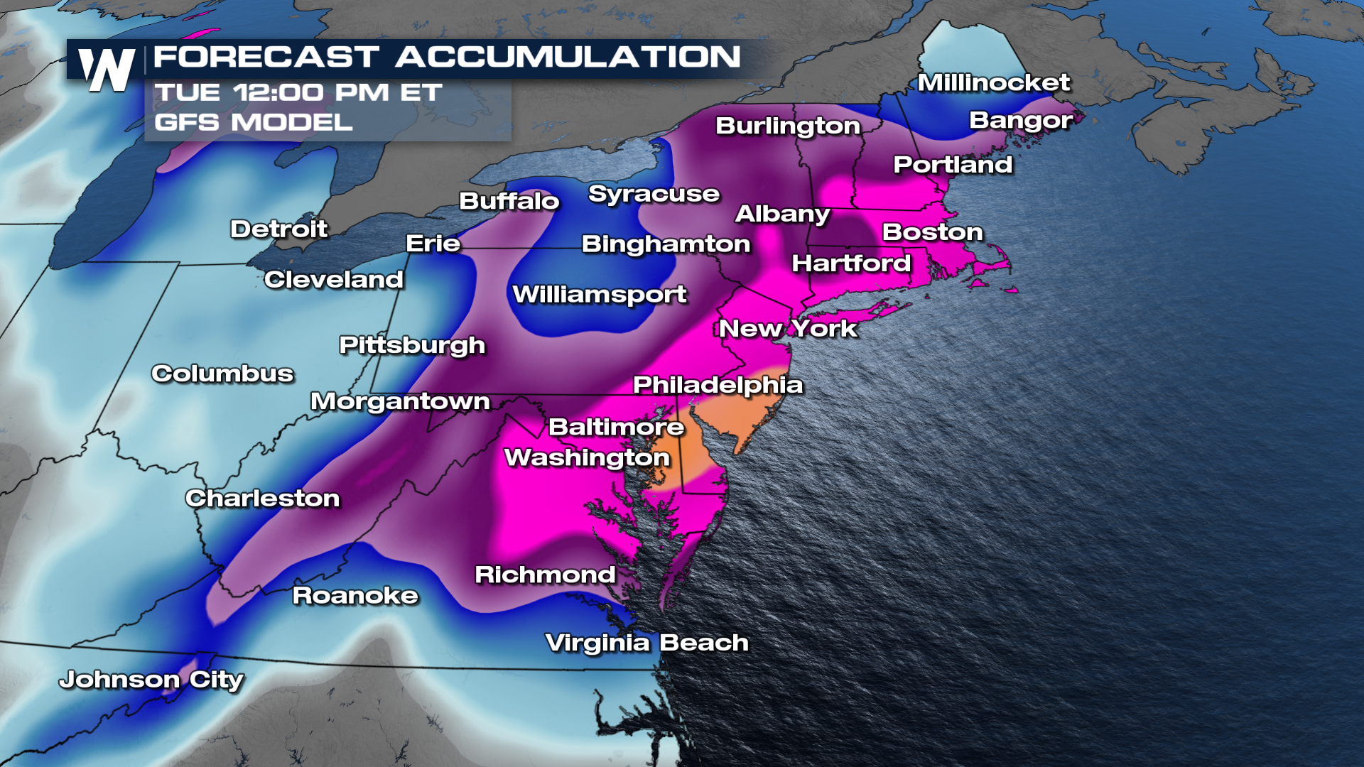 We like to show model comparisons for a high impact weather event so you can plan for multiple scenarios, until a solution is agreed upon anyway. The GFS Model (above) shows the (seemingly) high end potential for this event, with 1-2 feet of snow widespread from VA through New Hampshire.