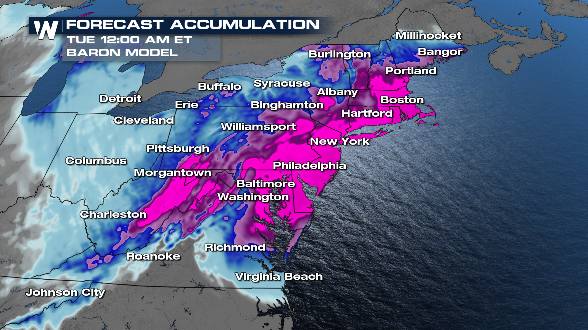 The Baron model (below) shows what looks like a more reasonable forecast, with pockets of 6-12" of snow from the Chesapeake Bay up through New England. It also shows the secondary bullseye in the Appalachians and Alleghenies with 6-12" of snow.