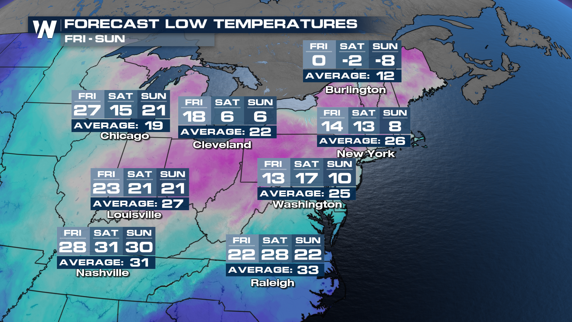 Morning temperatures will drop down to the single digits for many spots by the weekend. Burlington, VT will drop below zero.