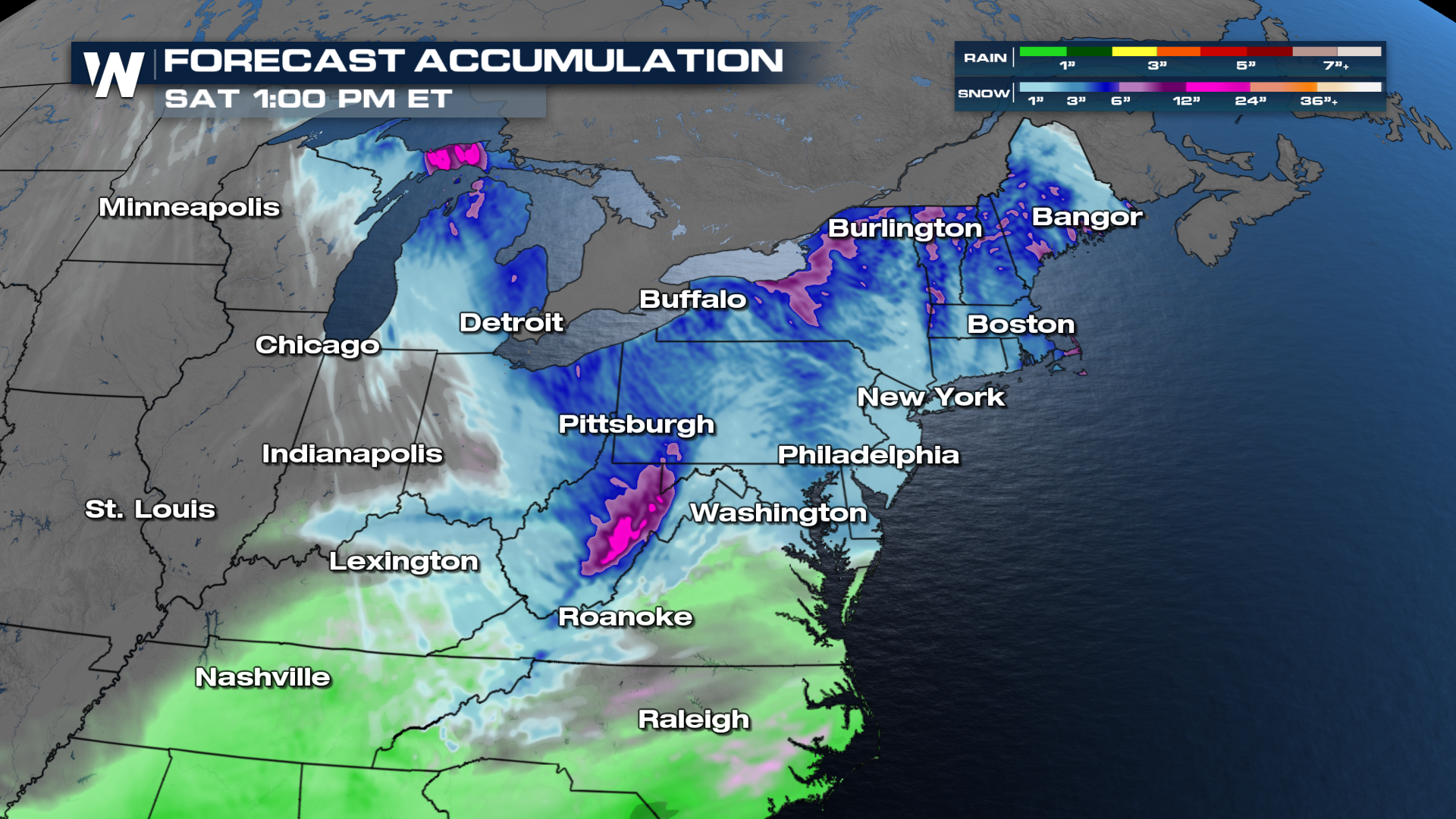 The highest totals look to be downwind of the Great Lakes. Other locations look to see a few inches of snow.