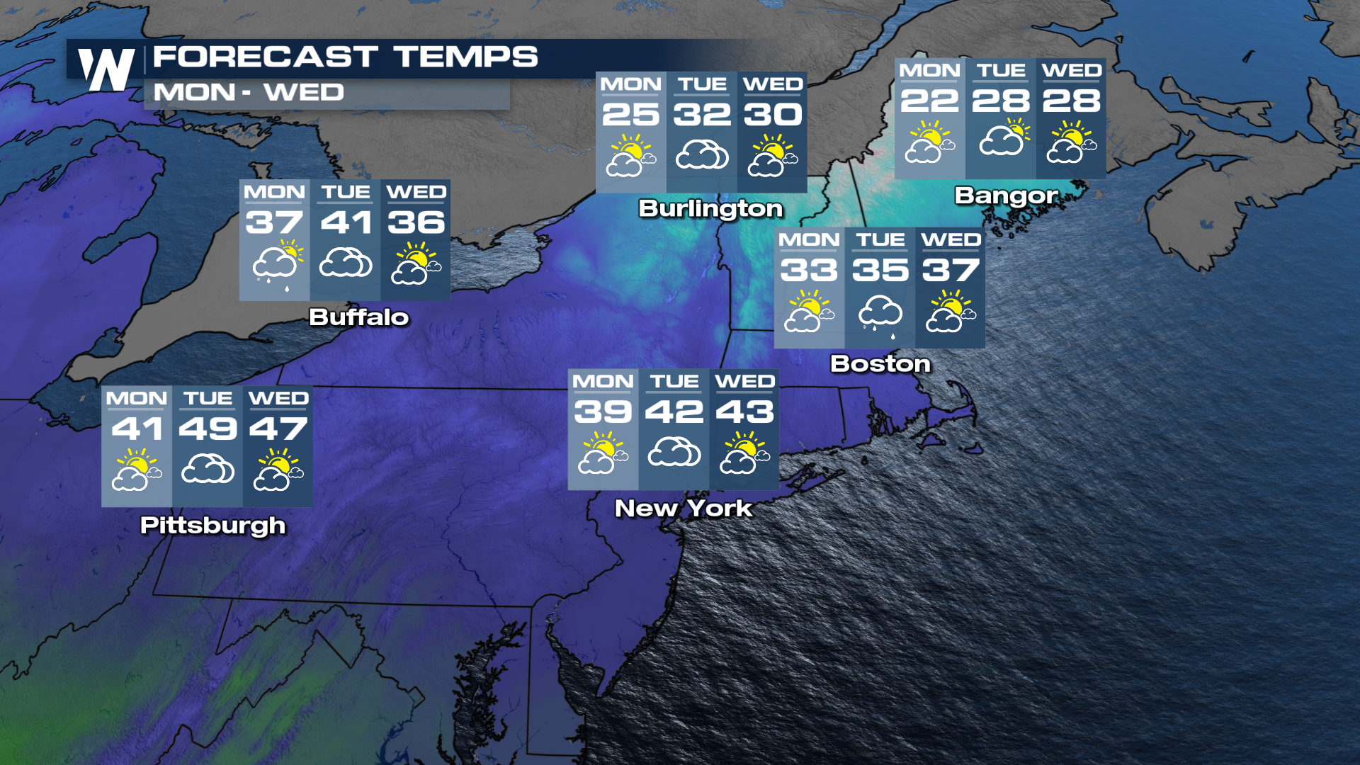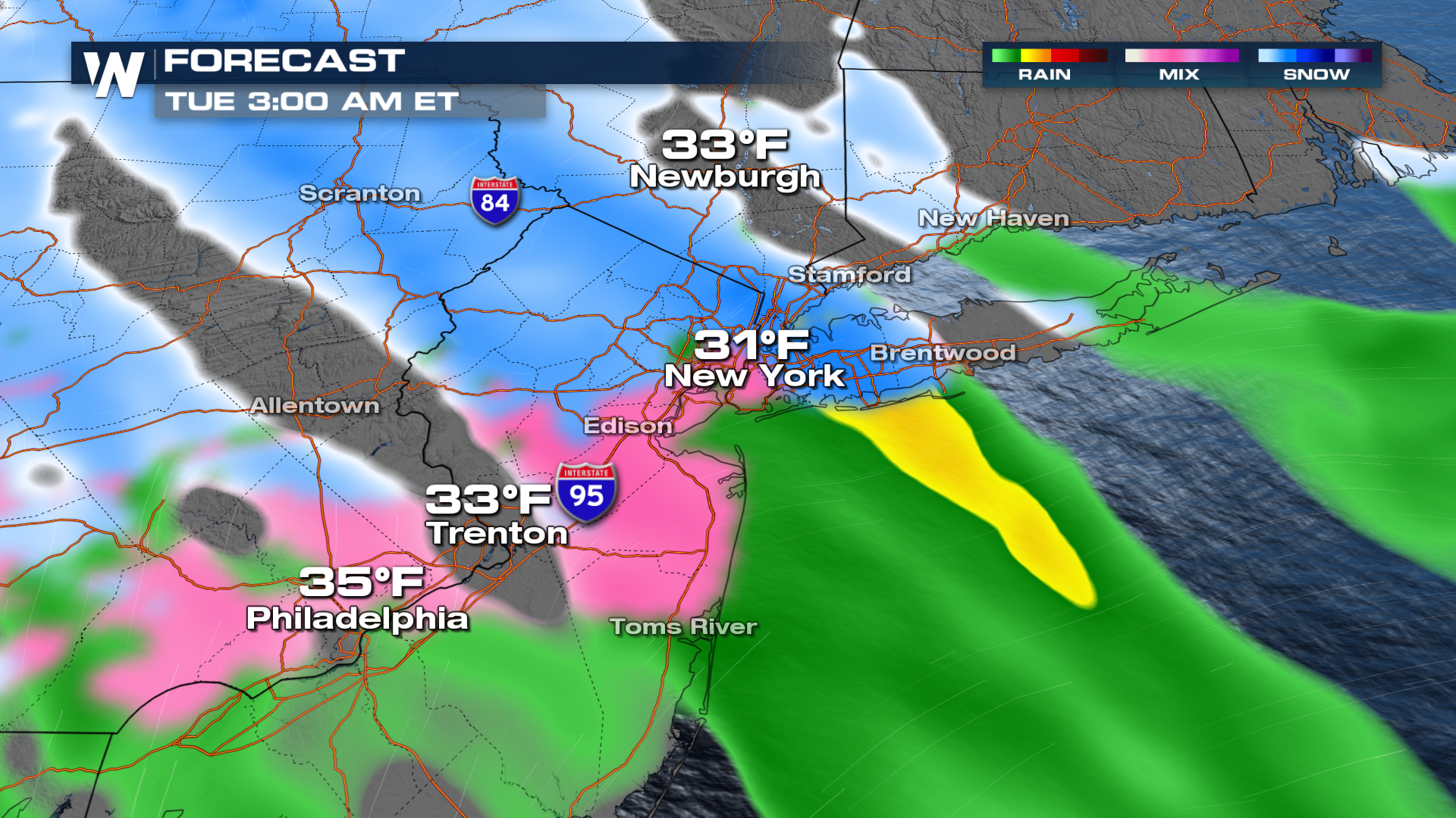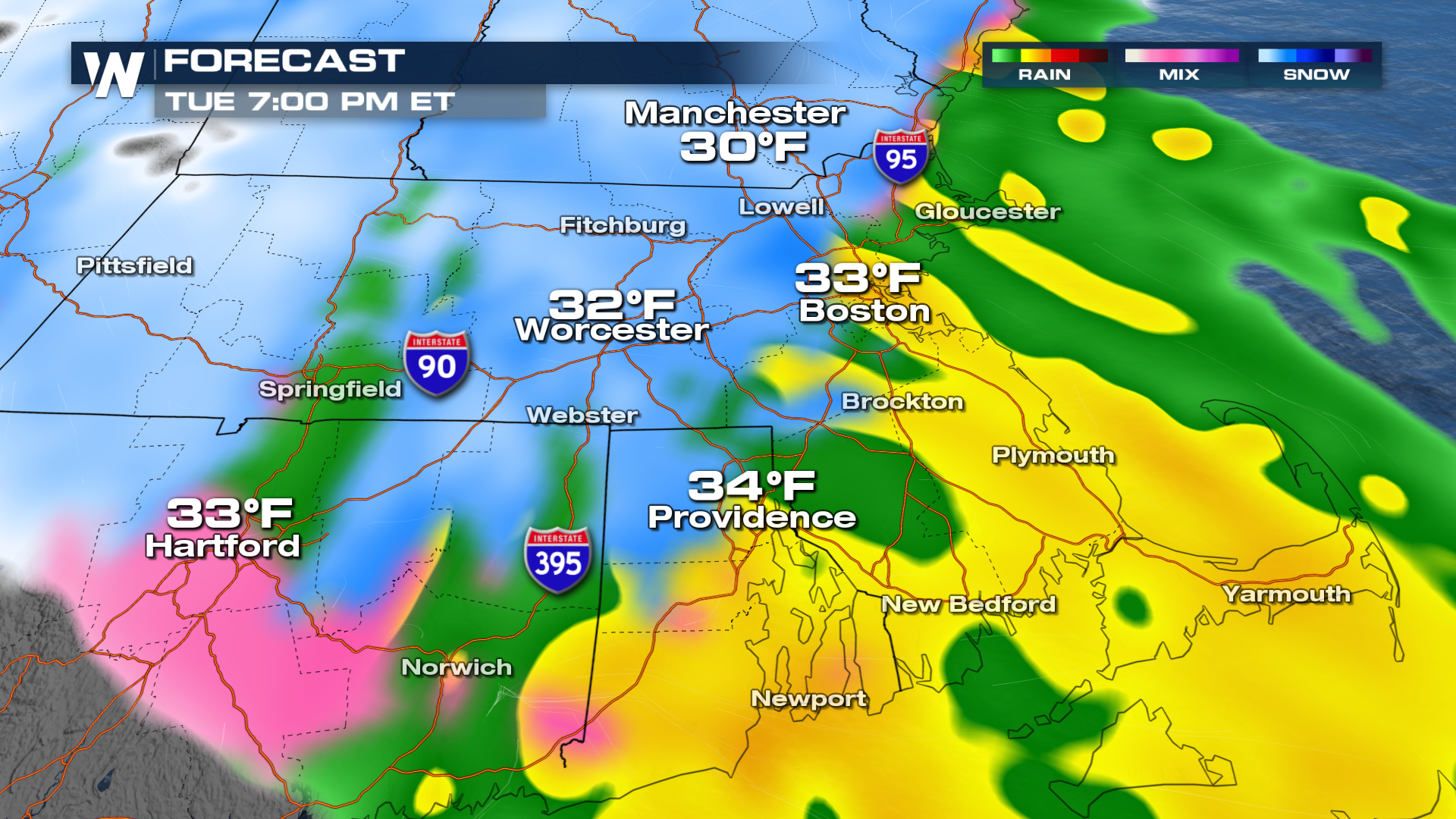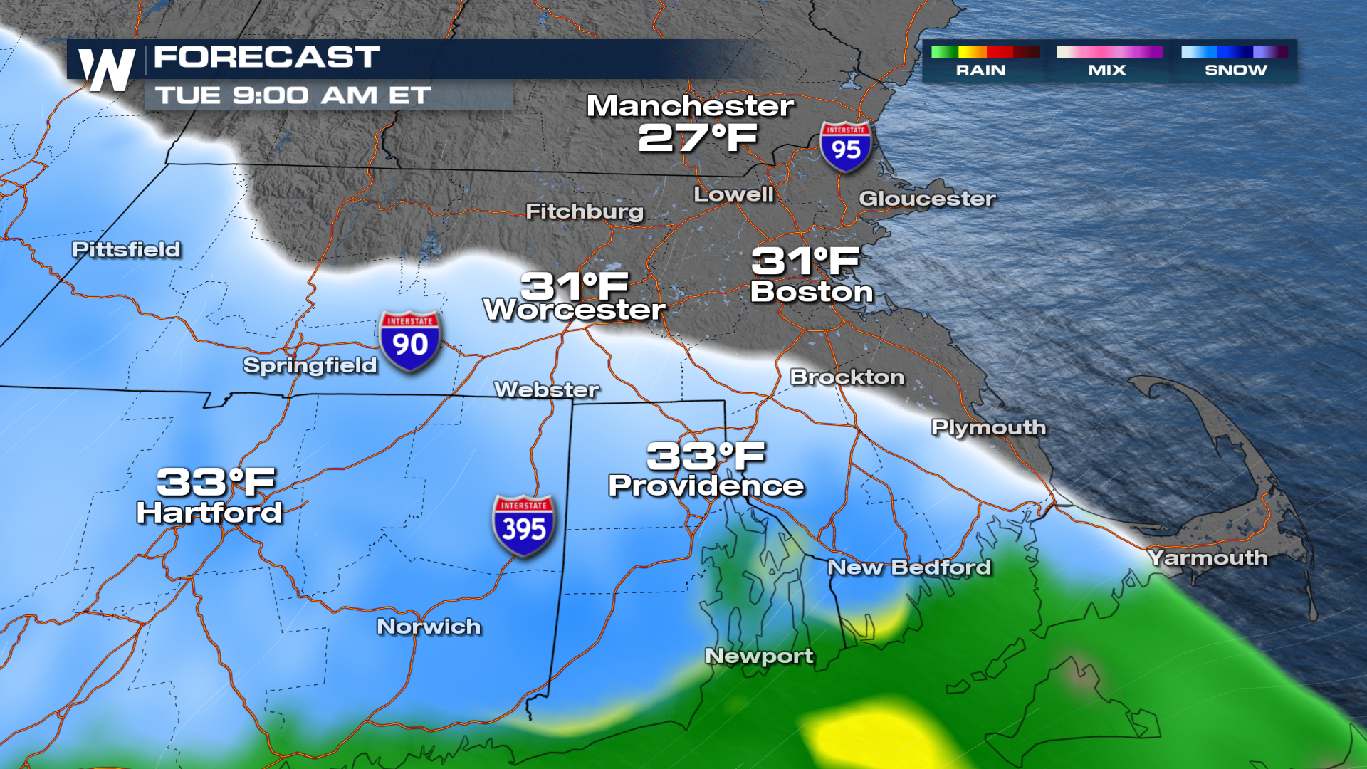 Boston AreaIn the Boston area, there are two rounds of potential wintry weather, one on Tuesday morning and another on Tuesday evening. Temperatures will be borderline, hovering right around freezing.