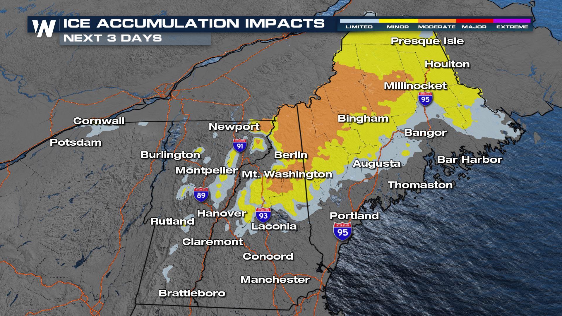 A Springtime "winter" storm is bringing heavy rain, strong storms, and the threat of significant icing to the Northeast as a warm front lifts north through the region. Enough cold air at the surface will support a widespread ice threat and moderate impacts as a result (above).