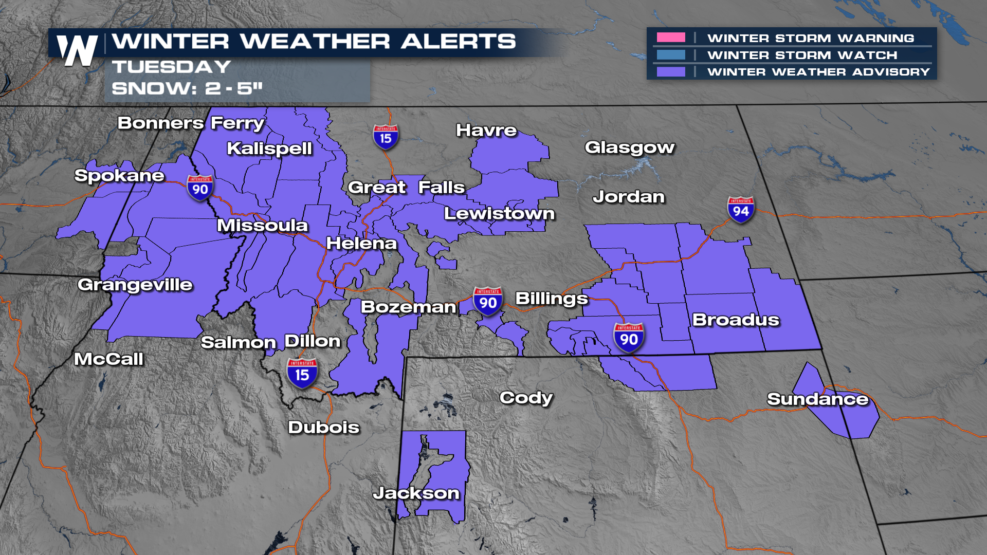 With the heavy snow likely to pile up in the mountains, several winter weather watches have been issued in the northern Rockies, lasting through Tuesday.