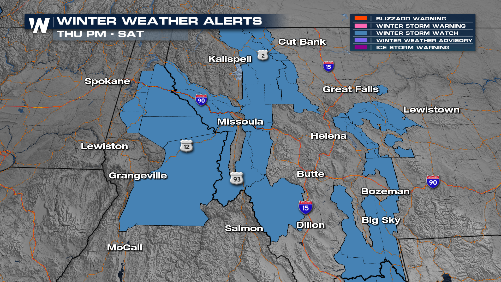 Winter weather alerts have been issued for portions of Montana, Idaho, and Wyoming for upwards of 8-14" of snowfall.