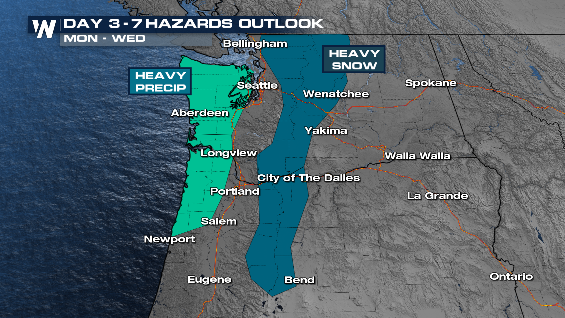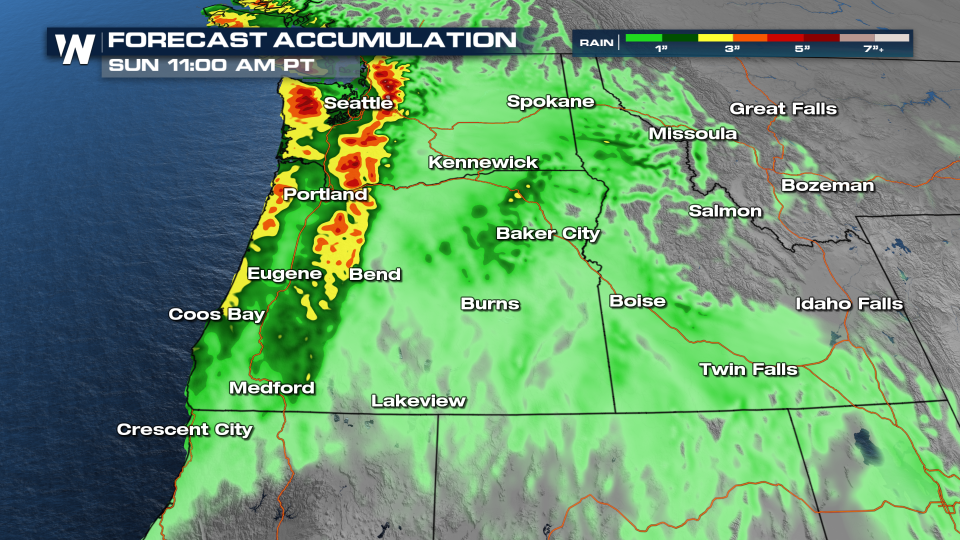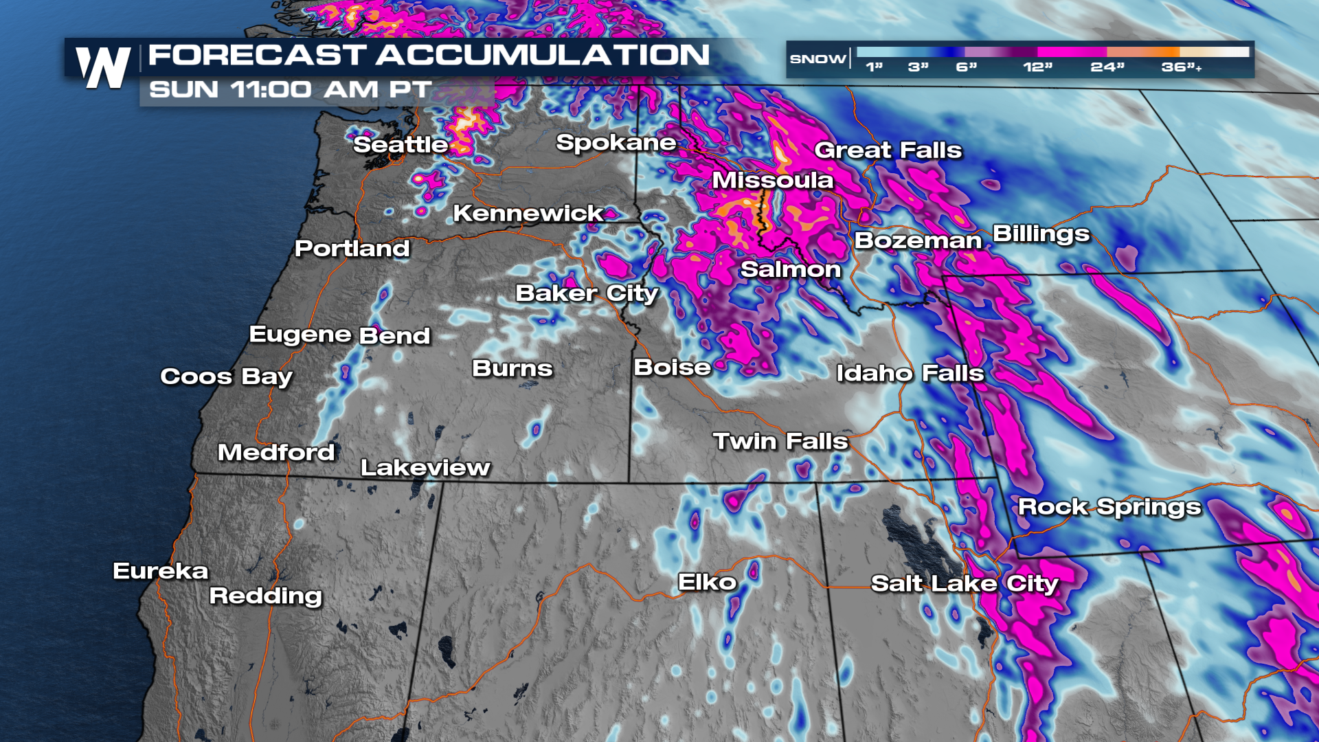 As this moisture moves up the mountains, snowfall totals will climb. The heaviest looks to happen in the Cascades of Washington and the Rockies. The Blue Mountains and Tetons also get a decent amount too.