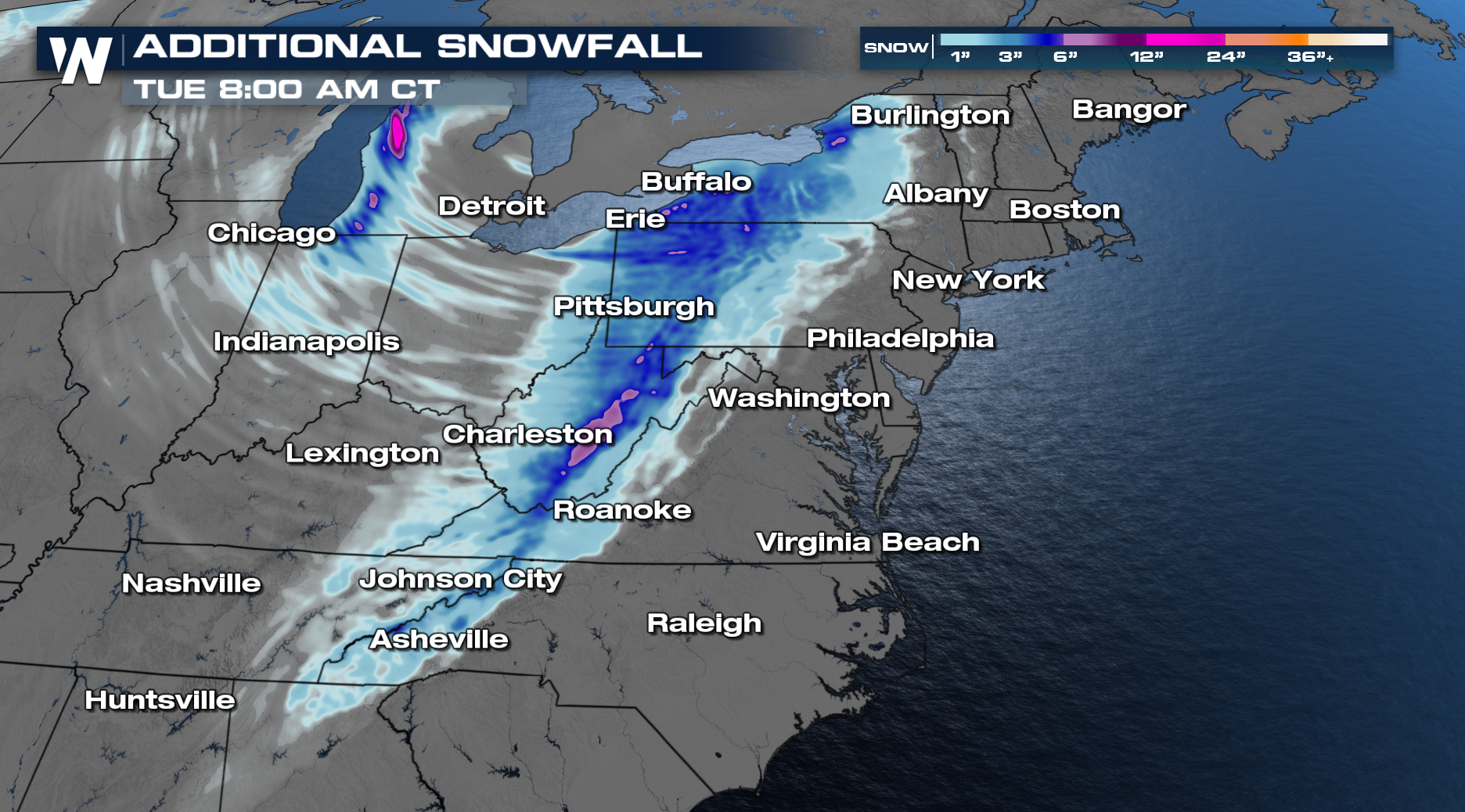 Parts of Wisconsin and the Upper Peninsula of Michigan still have the potential for significant totals. Lake effect snow will stick around into Tuesday, adding an additional 6-12".