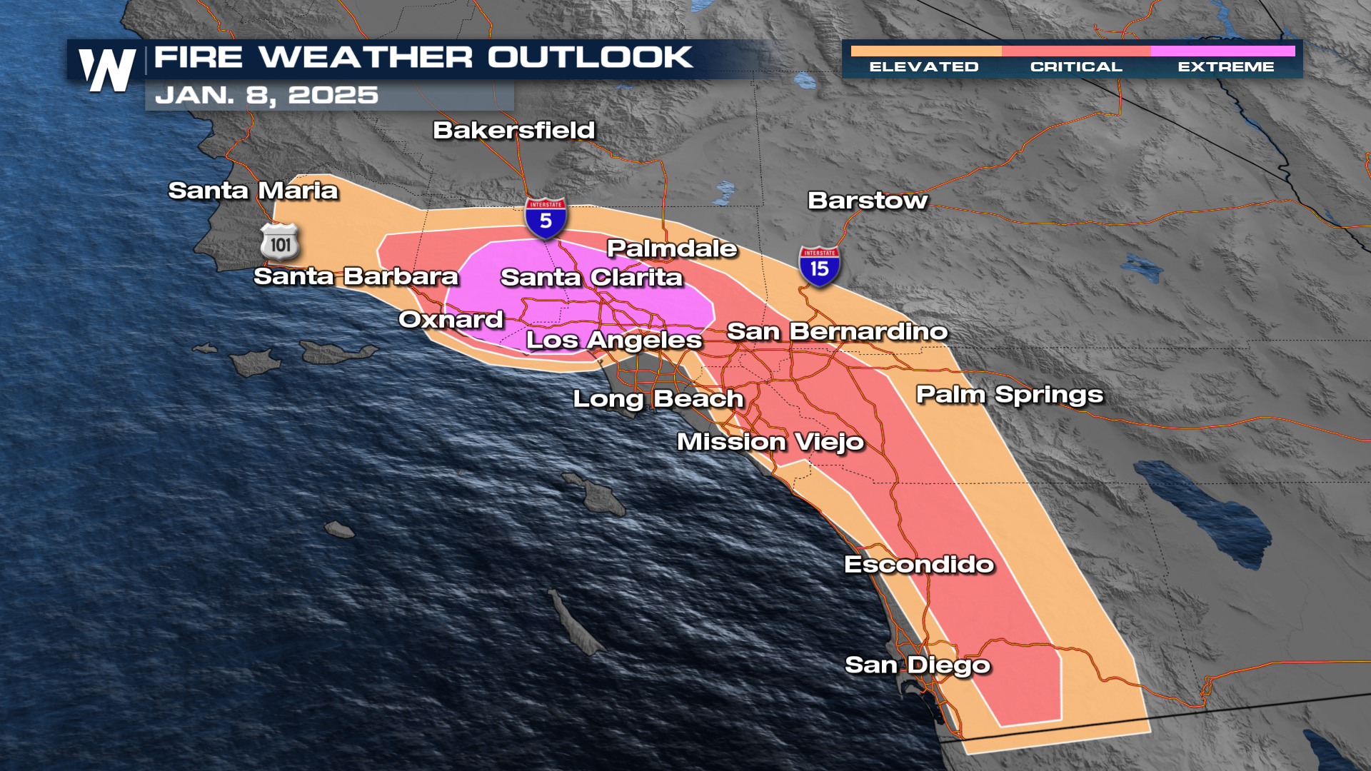 The fires ignited during a period of extreme fire weather, fueled by prolonged drought, critically low humidity, and strong offshore winds. The Palisades fire initially started with an open flame in the Pacific Palisades neighborhood of Los Angeles. Firefighters were able to contain the flames above ground, but the fire continued to burn underground. At the time of ignition, relative humidity values dropped into the single digits, while wind gusts frequently exceeded 40 to 60 mph, creating ideal conditions for the rapid spread of the fire. The National Weather Service even issued a Particularly Dangerous Situation for these fires. These factors allowed flames to move miles in just hours, overwhelming containment efforts during the initial stages. The Palisades fire grew to 23,707 acres.