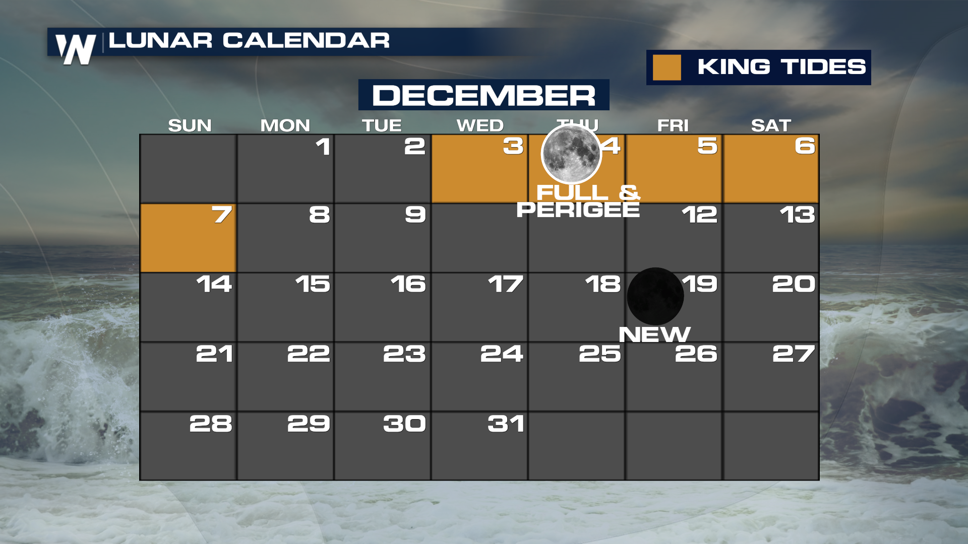 King tides are most pronounced when the moon is at its closest point to the Earth in its orbit, which is known as perigee. This is happening at the same time as the full moon for both November and December, creating what's known as a supermoon. During these supermoon events, the moon will be about 14,000 miles closer to the Earth than normal!