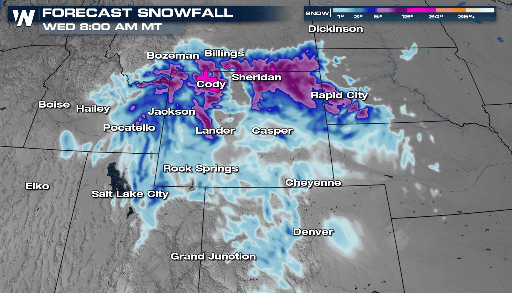 The snow begins to move east through South Dakota, Wyoming and even a bit of Colorado through Tuesday - Wednesday.
