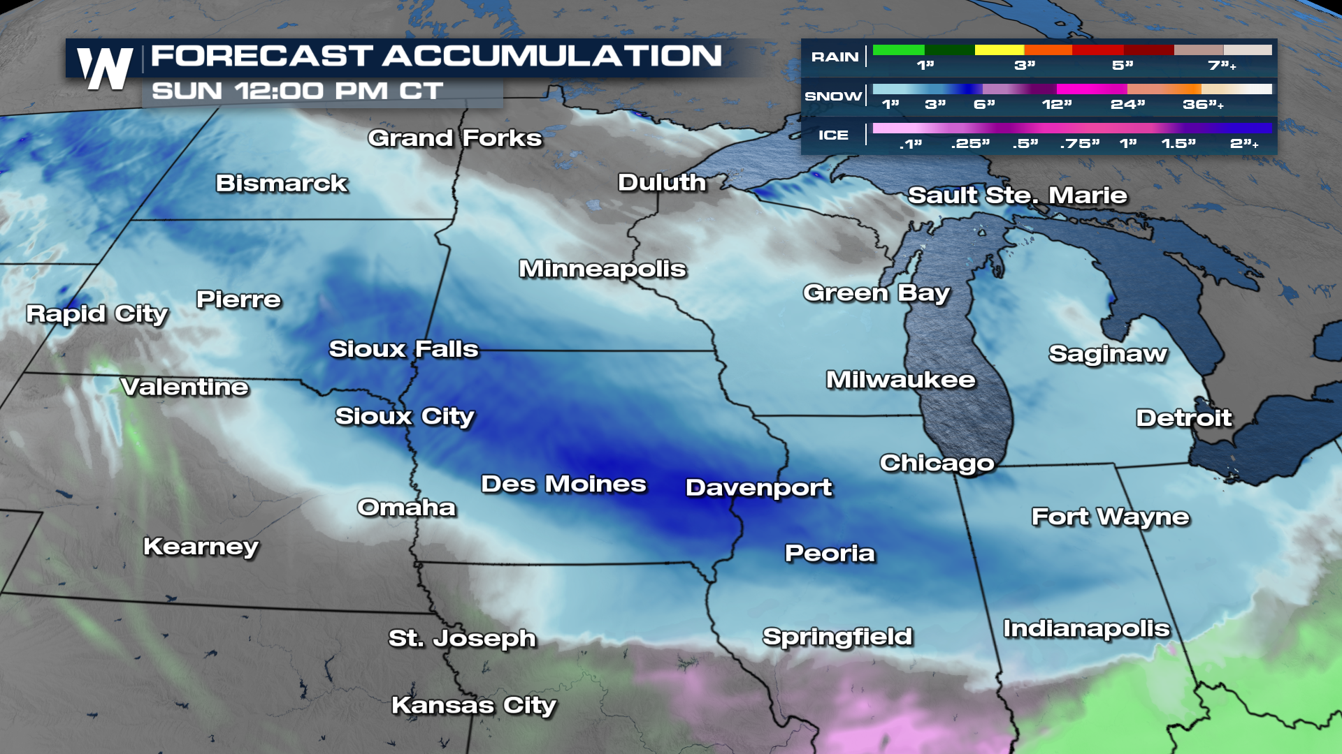 While this system moves across cities that were impacted by heavy snow last weekend, this upcoming system won't be quite as powerful. However, we can expect a wide swath of snow from eastern Montana through Ohio of 1-3". Higher totals may be noted from Sioux Falls, across Iowa, and into the Quad Cities.