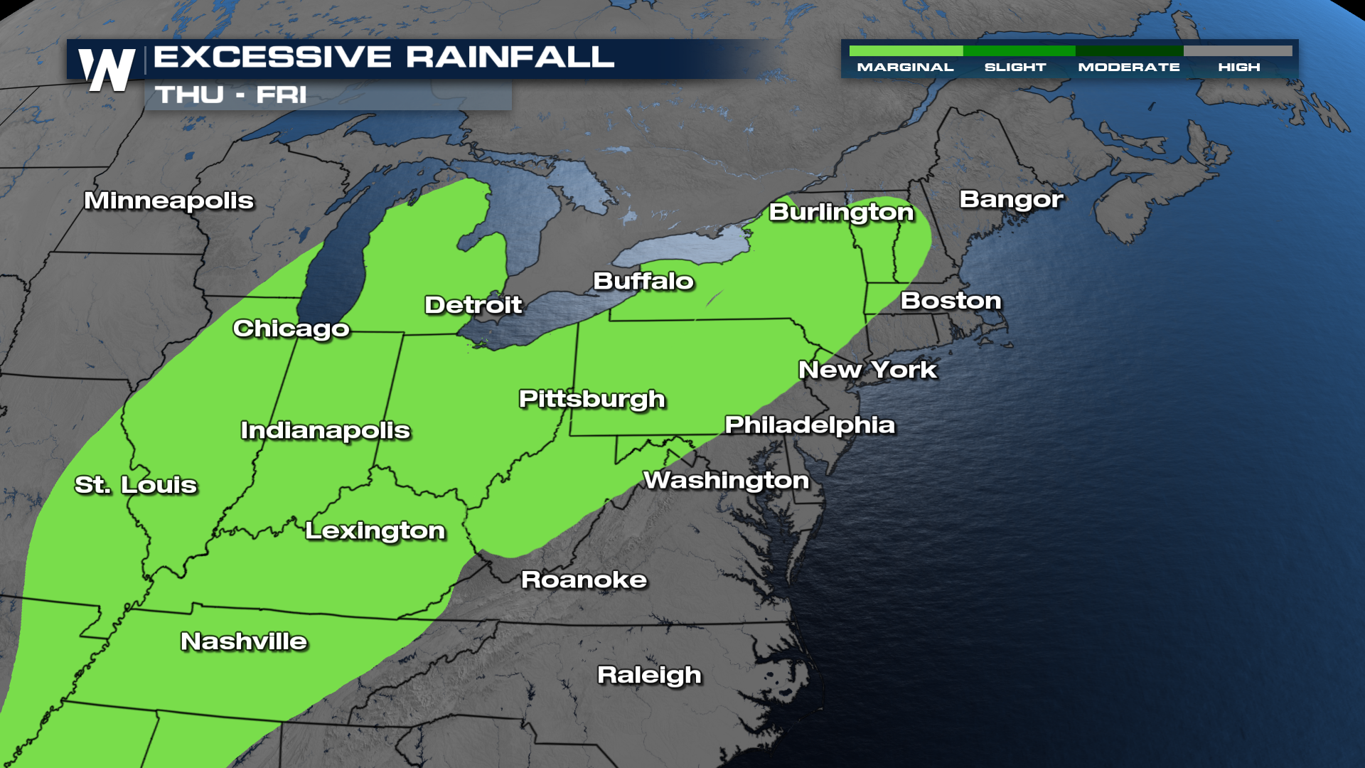 Thursday and Friday look to be the wettest from the Ohio River Valley to the New England states. While the severe threat appears pretty limited at this time, with a MARGINAL risk for severe storms on Thursday, the flooding threat will move in too.