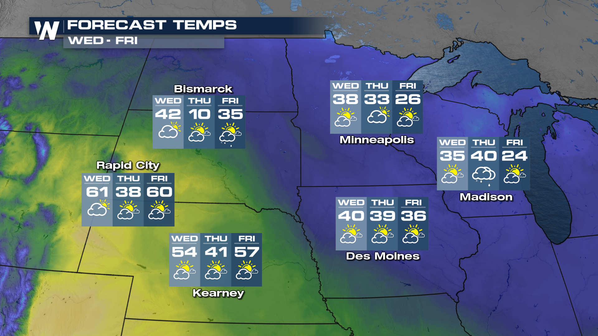 For some, temperatures will be impacted by this front. For instance, look at Bismarck, North Dakota, a high of 42 on Wednesday and 30 degrees cooler by Thursday with a high of 10.