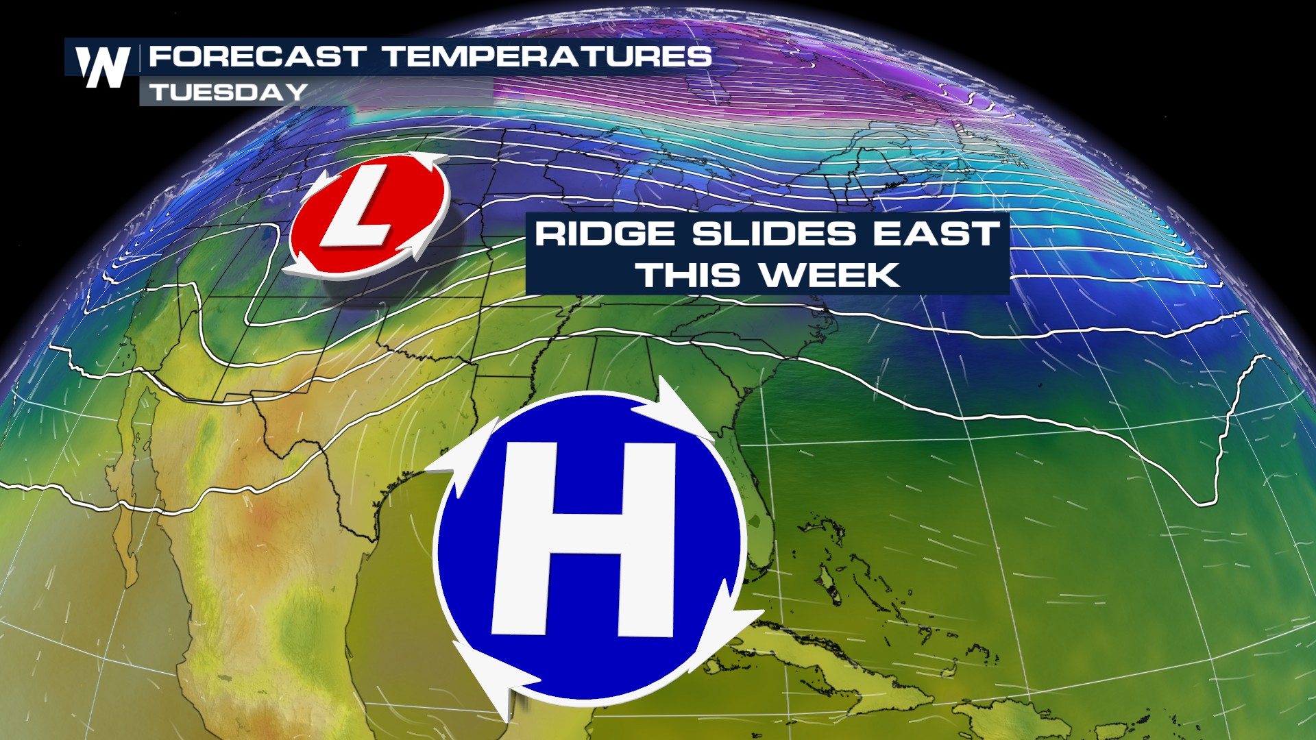 An upper-level ridge that won't leave us alone is sliding back to the east this week. That will keep the tranquil weather nearby and push temperatures into record territory.