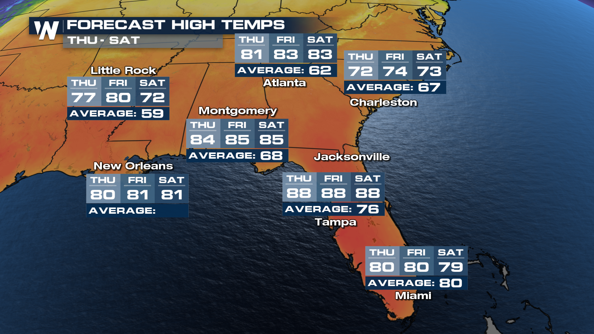 It's already warm in the southeast, with highs soaring into the upper 70's and low 80's. We'll creep closer to record territory as the week progresses, with numerous highs falling from Thursday through Saturday. Some of that will spill into the Ohio River Valley as well, with highs at least 15° warmer than normal.