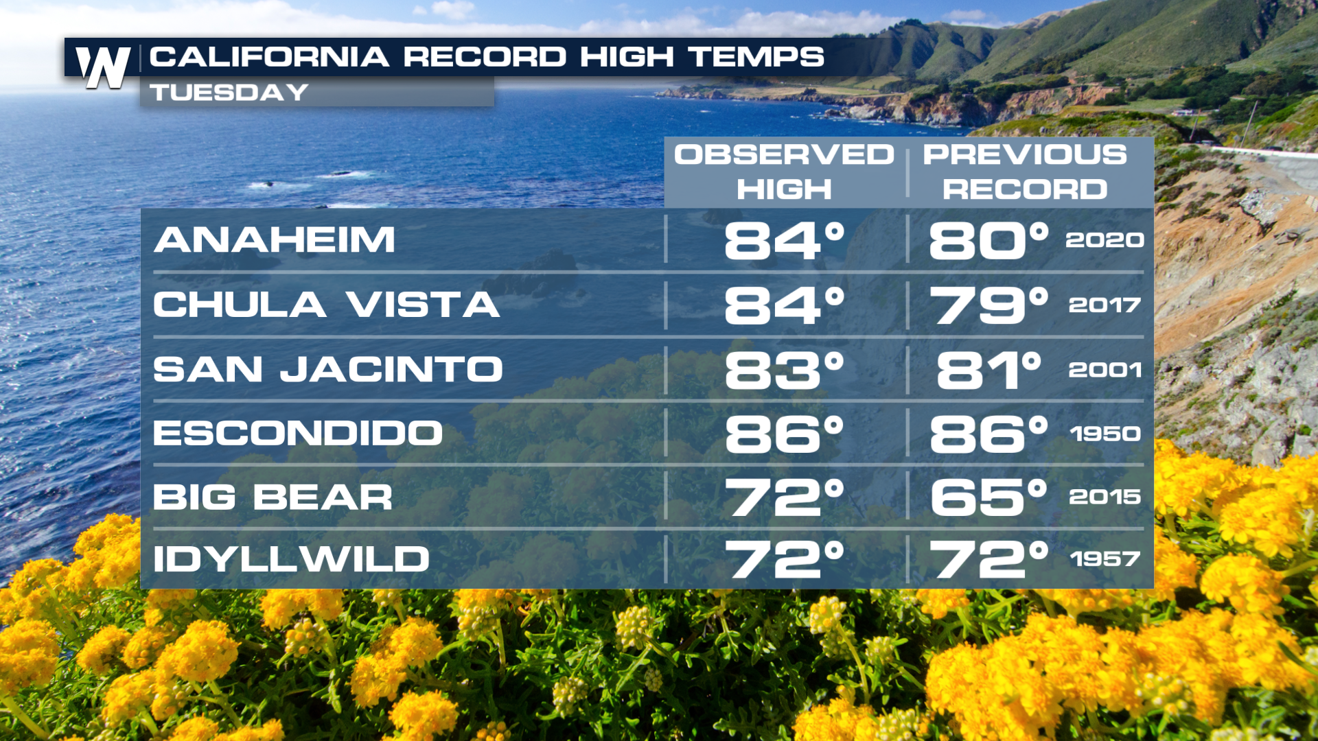 High pressure in the upper levels of the atmosphere means sinking, compressing air, and generally warmer temperatures. On Tuesday, multiple record high temperatures were set, including 84° in Anaheim!