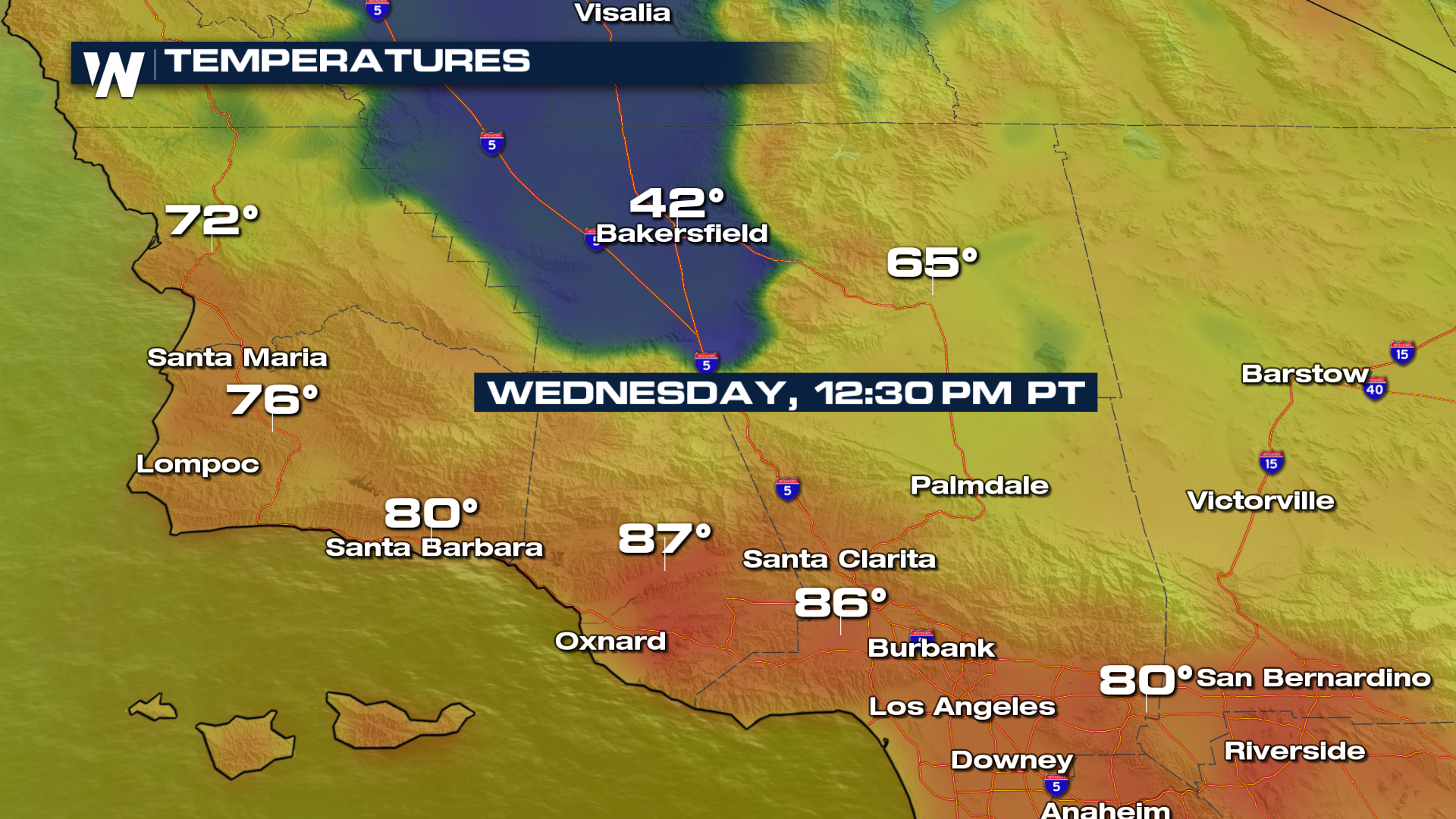 The fog is making a huge difference in temperatures! Early Wednesday afternoon, Bakersfield was sitting under gray skies and a temperature of 42°. At the same time, over the Grapevine and into the valleys, temperatures were pushing into the upper 80s with blue skies!