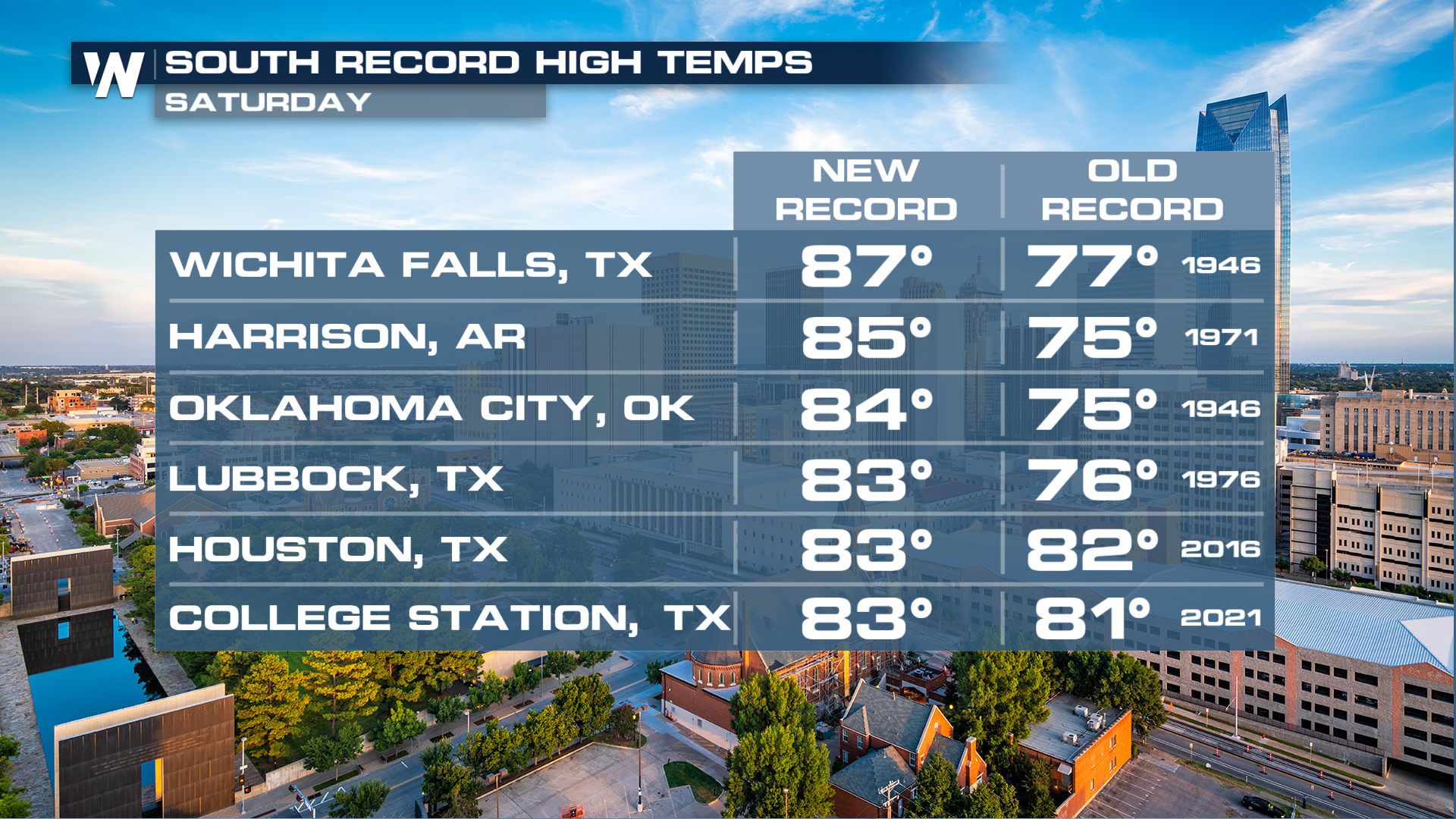 More records have been falling throughout the day on Saturday. It's not just that many records have been falling recently; it's how easily they are going down. We've seen multiple records fall by 10° or more, including a record of 87° in Wichita Falls!