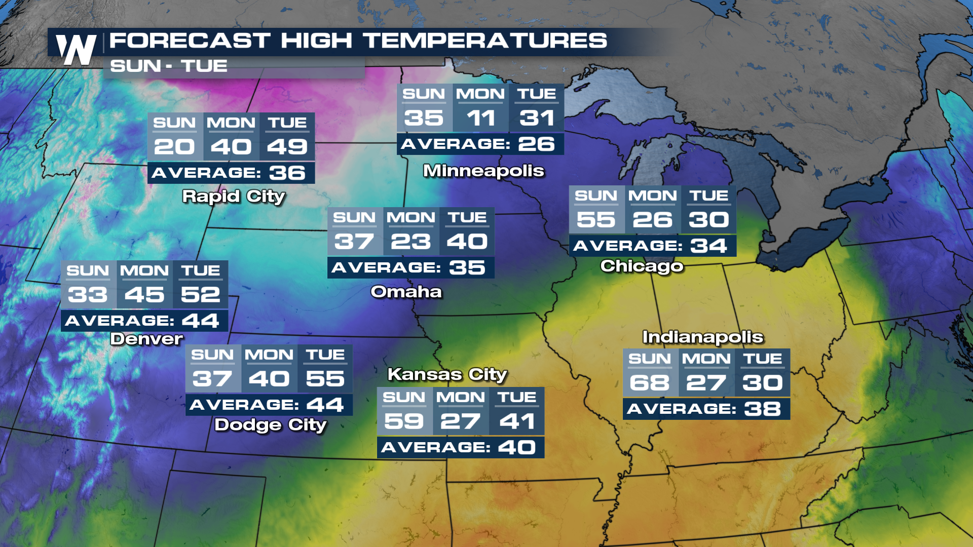 Feast your eyes on Sunday! Some cities will see a HUGE drop in temperatures as a cold front blasts south. Denver will go from near 60° on Saturday to a high of just 34° on Sunday. Salt Lake City will drop to the mid-30s on Sunday as well. Omaha, Nebraska, will see a high of 60° on Saturday, but by Monday, temperatures will only rise into the low 20s! (Read more here)