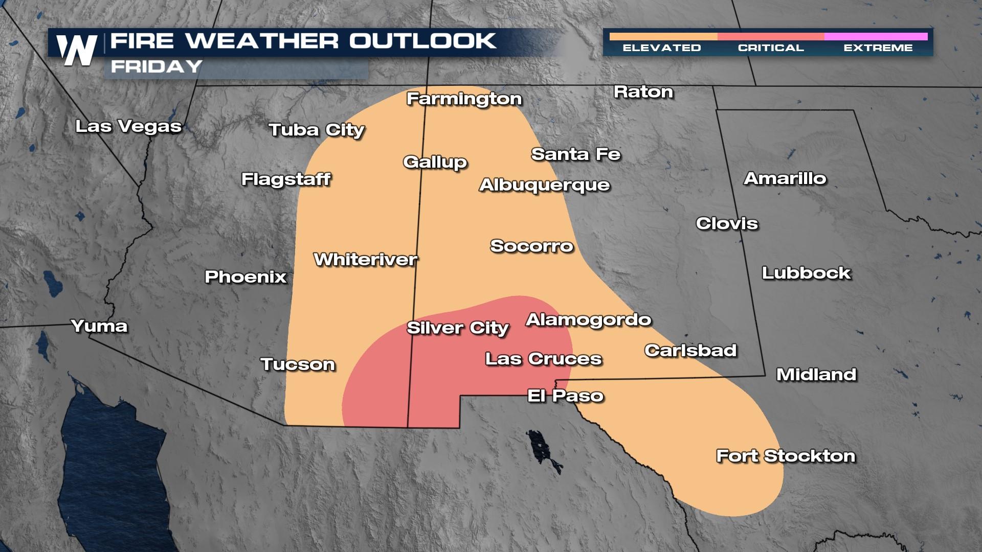 Dangerous fire weather conditions are expected once again across southeastern Arizona, southern New Mexico and West Texas Friday. A cold front will sweep through the region but with so much dry air in place, the gusty winds will enhance the fire danger for the region.